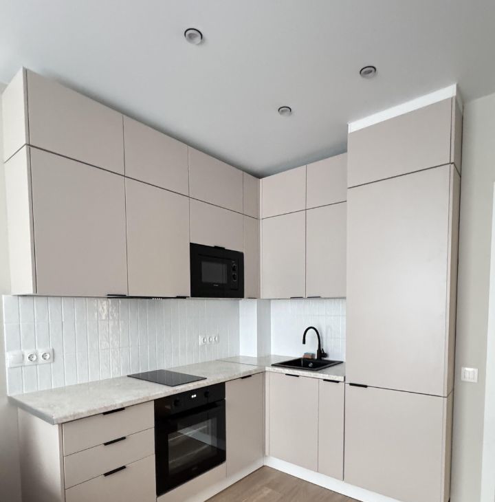 Современная встроенная кухня со всей необходимой бытовой техникой: холодильник, плита, духовка, свч, посудомоечная машина. Окна во двор.