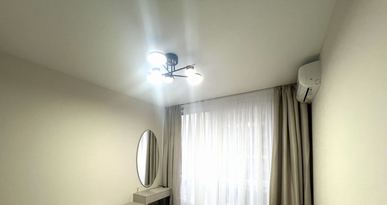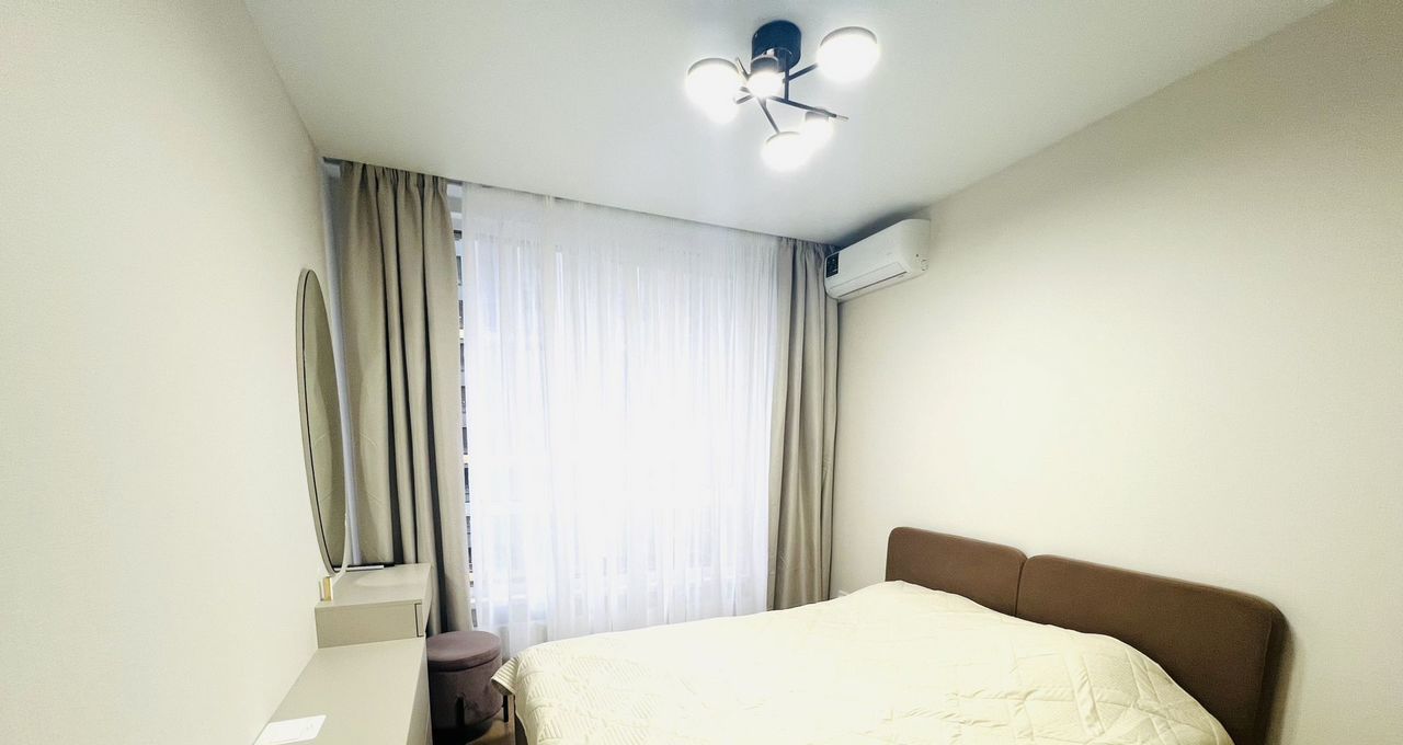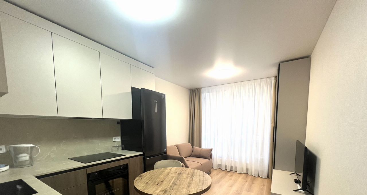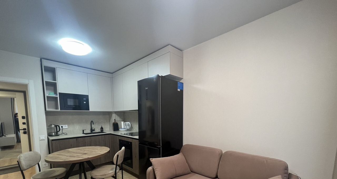 В квартире новый ремонт. Просторная кухня площадью оснащена всей необходимой бытовой техникой, включая холодильник и микроволновую печь. В гостиной установлен кондиционер и телевизор, а также удобный диван и обеденный стол.
