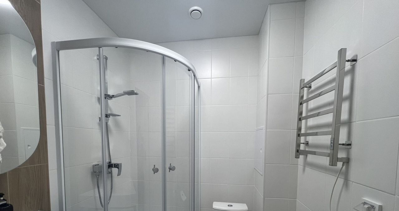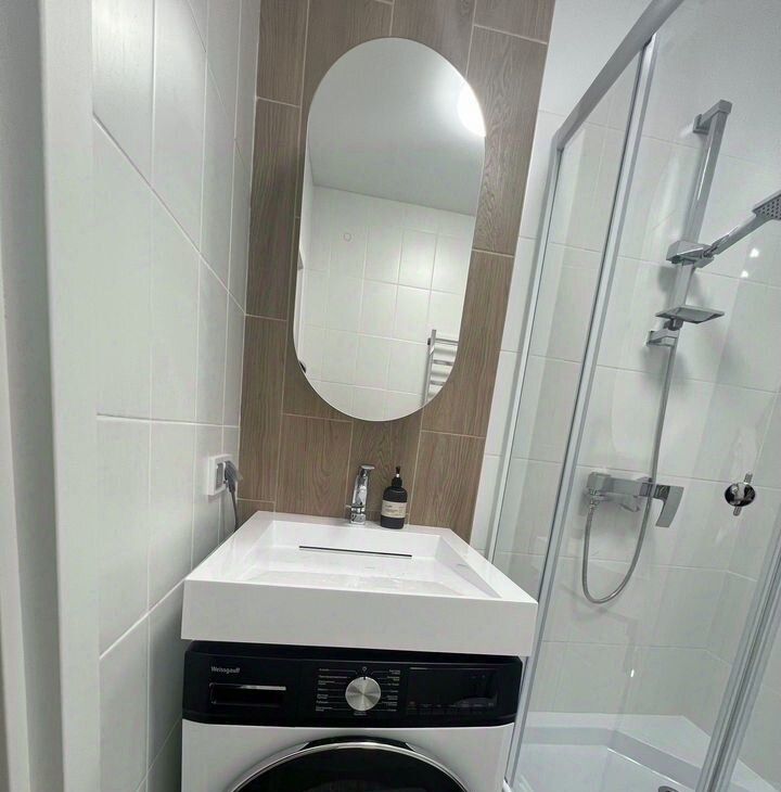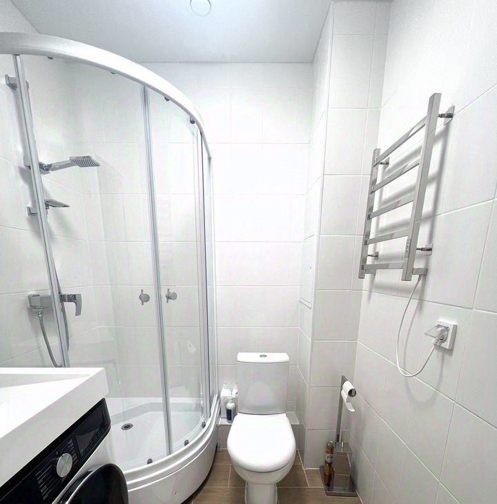 Совмещенный санузел оборудован душевой кабиной и стиральной машиной.