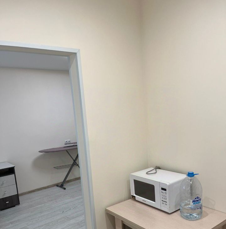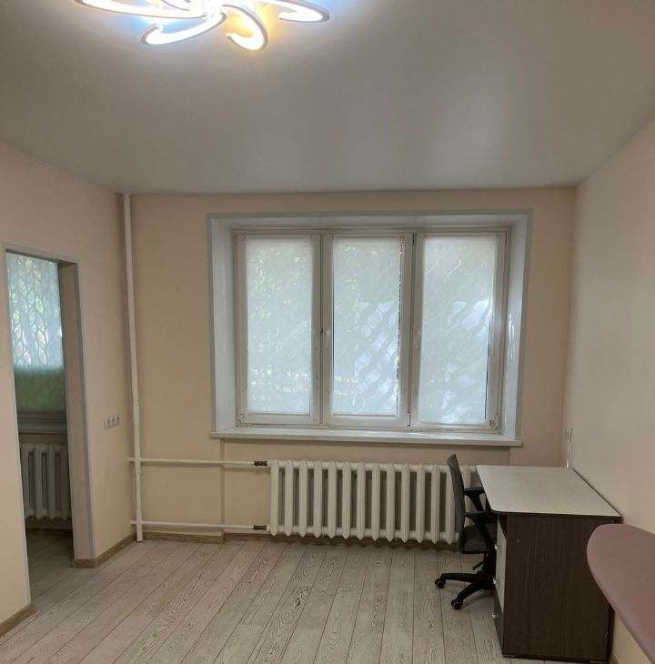 Однокомнатная квартира на 1 этаже. Просторная комната. Меблирована, есть все необходимое : 2 дивана, шкаф трехстворчатый, стол письменный, кресло офисное, полки.