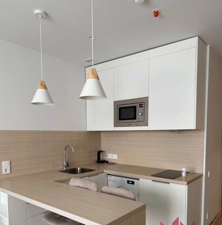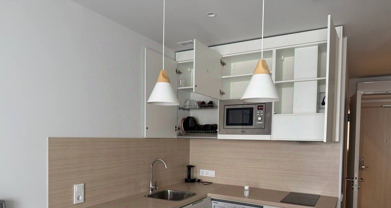 — Полностью оборудован все техникой (плита, микроволновка, чайник, холодильник с морозилкой, посуда, стиральная машина)