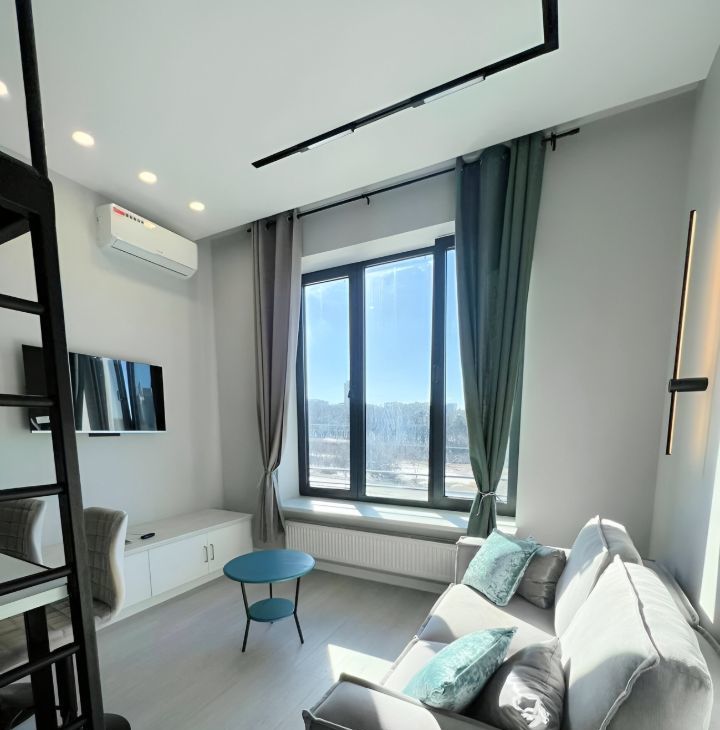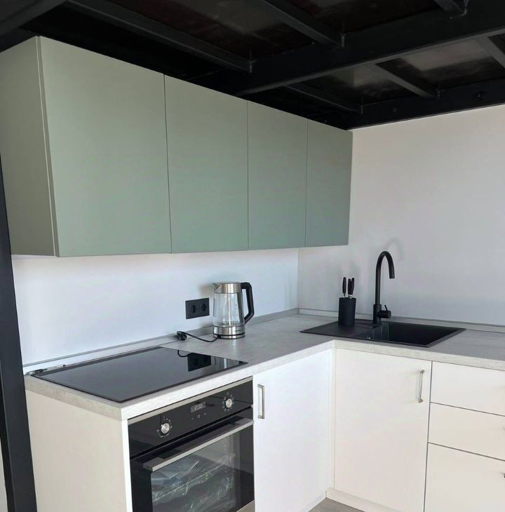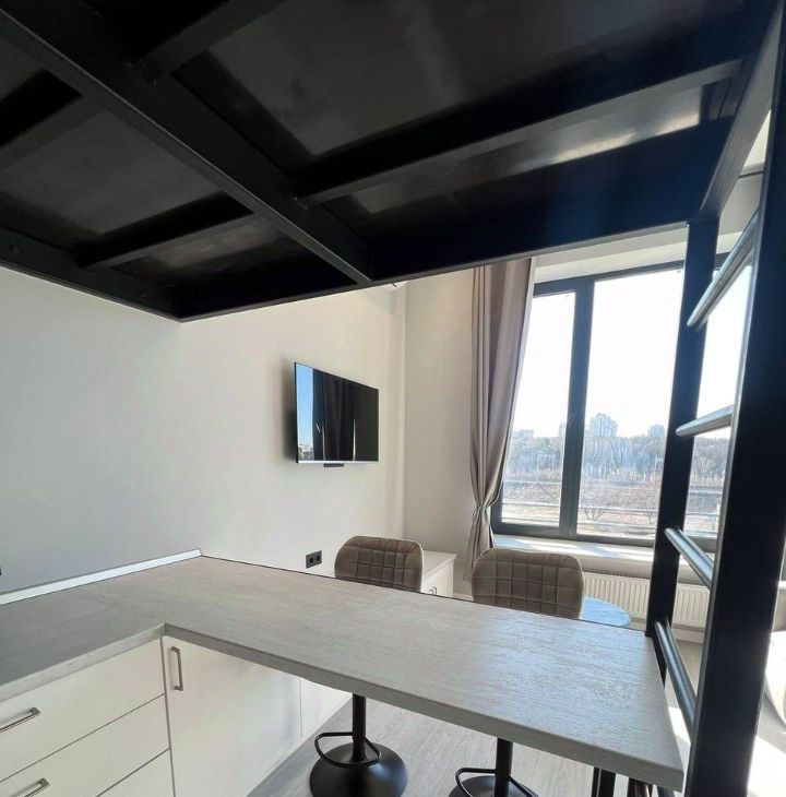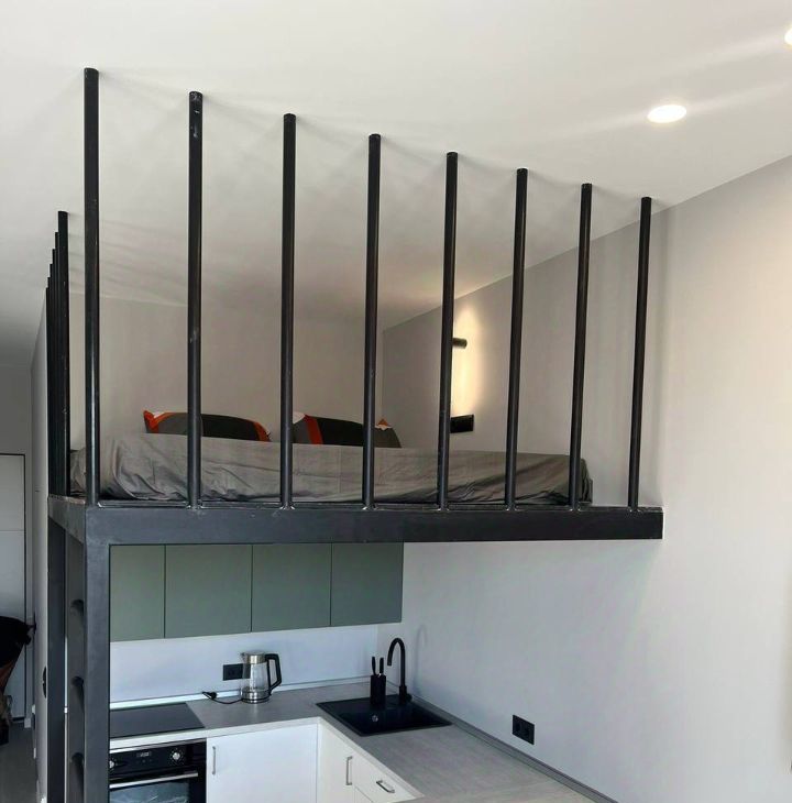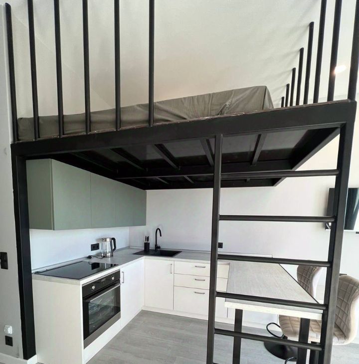 Диван раскладывается, двуспальная кровать над кухонной зоной.
