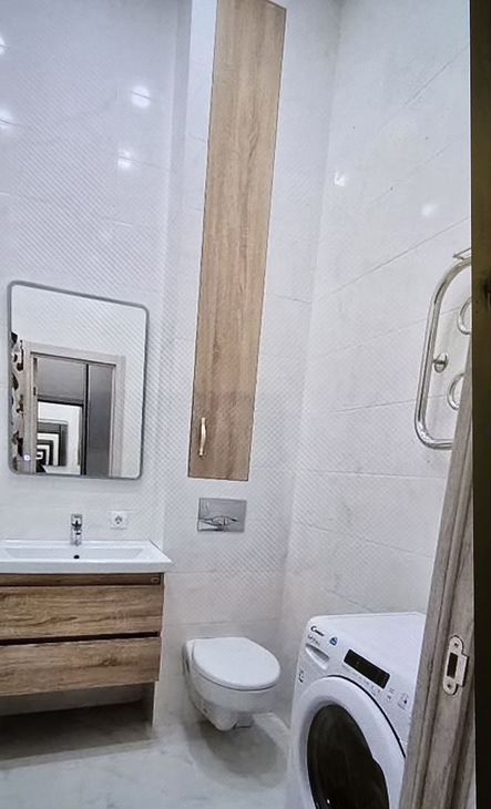 В квартире выполнен хороший ремонт, есть всё для комфортной жизни, кондиционер, посудомоечная машина. Чистый подъезд, качественная входная дверь, ухоженная придомовая территория.