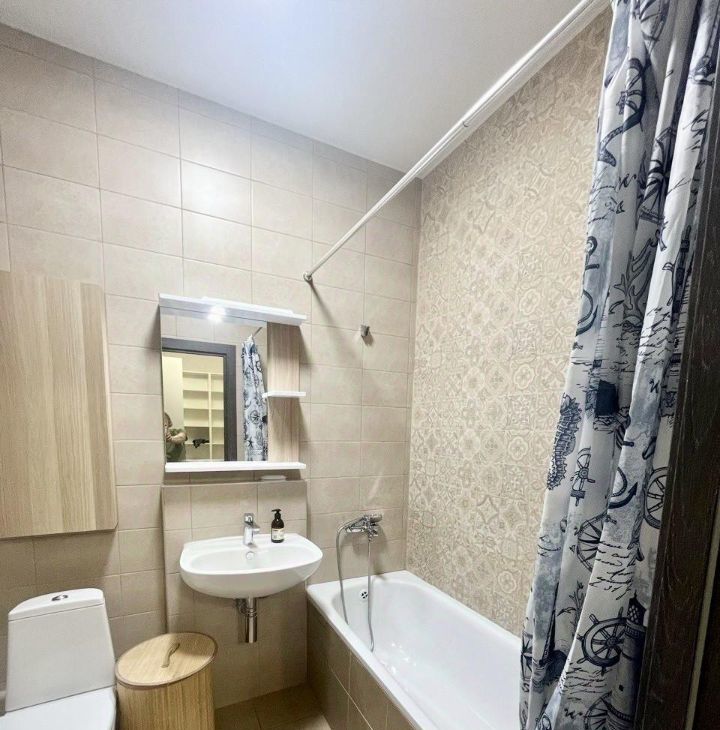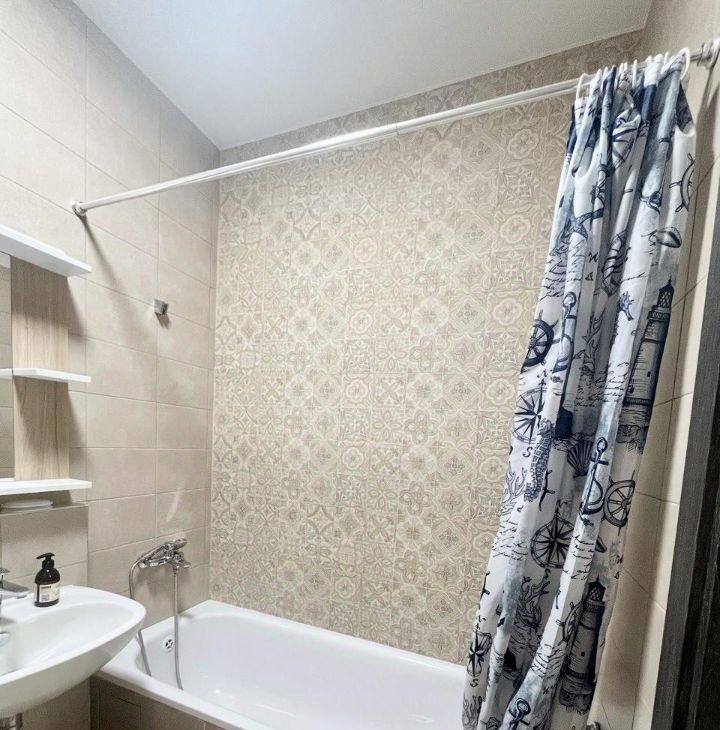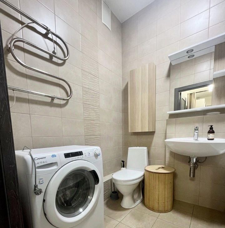 Установлена вся необходимая техника: кондиционер, холодильник, телевизор и стиральная машина. Ванная комната оборудована ванной, санузел совмещенный.