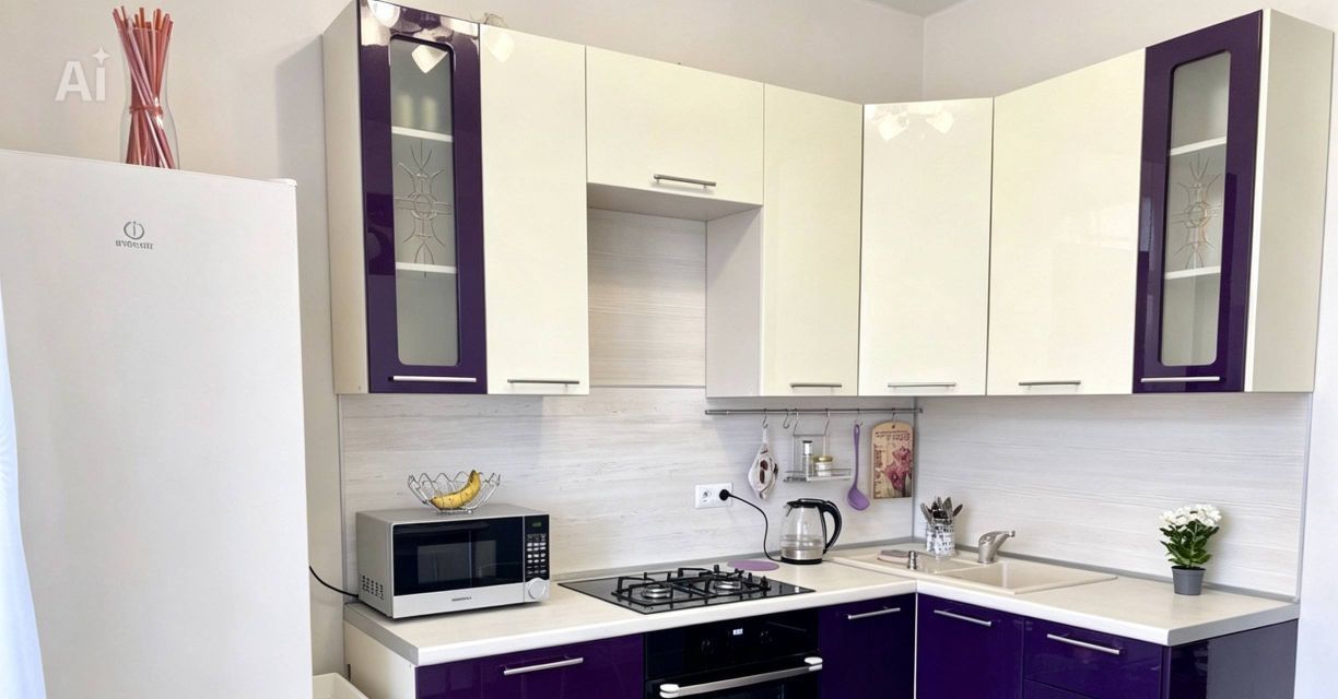 Мебель на кухне и в комнате обеспечивает комфортное размещение.