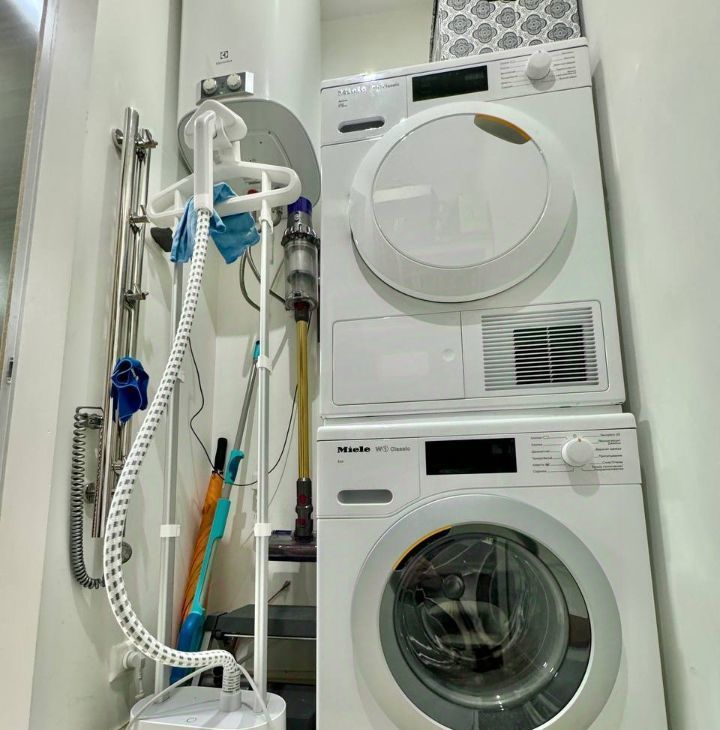 Постирочная/кладовая: Стиральная и сушильная машины Miele, отпариватель. Стеллаж для инструментов, ниши для лестниц, коробок, чемоданов и тд.