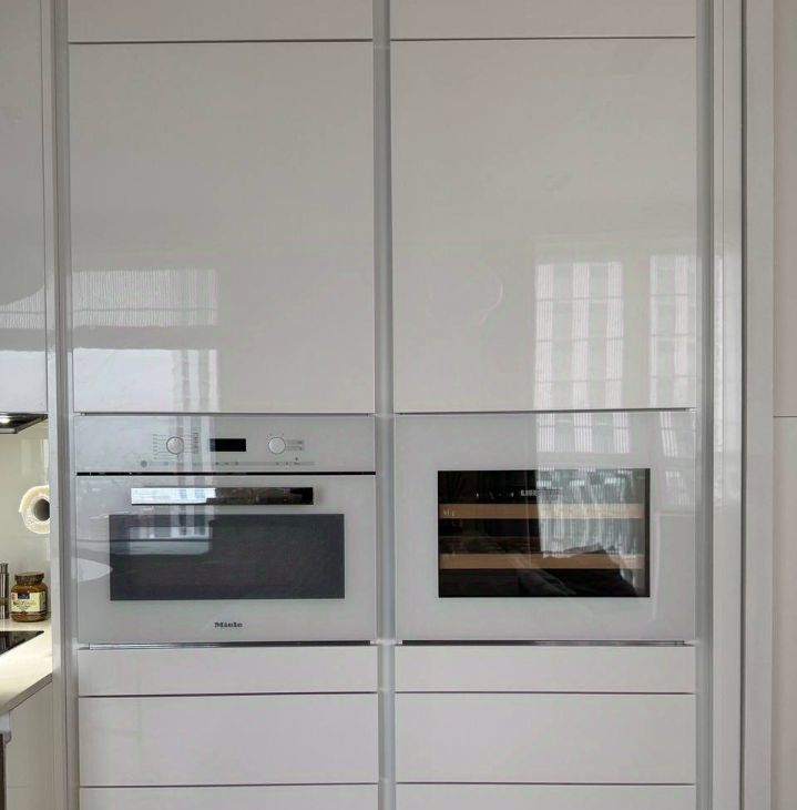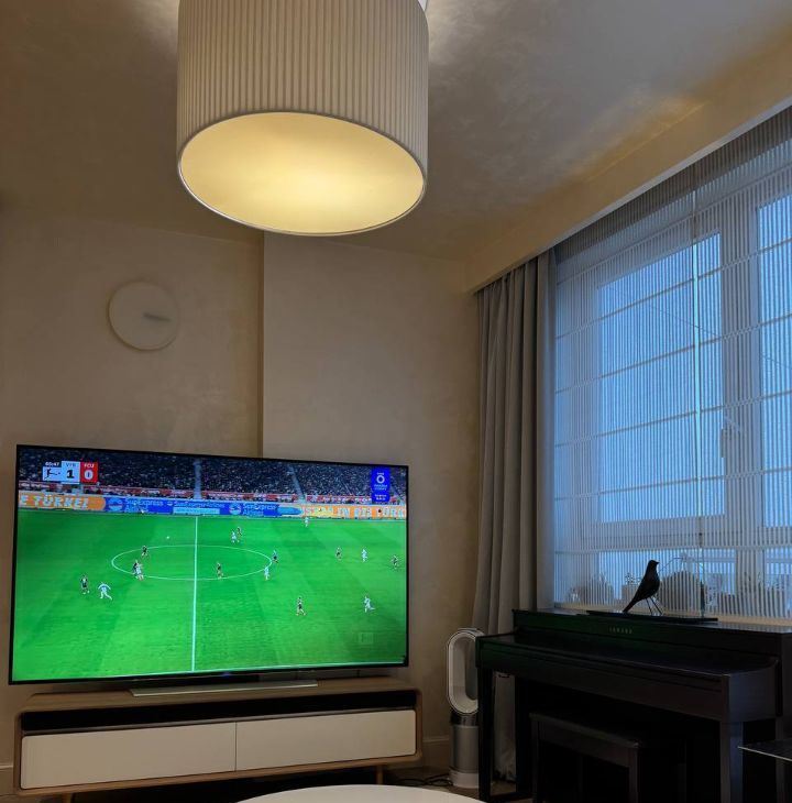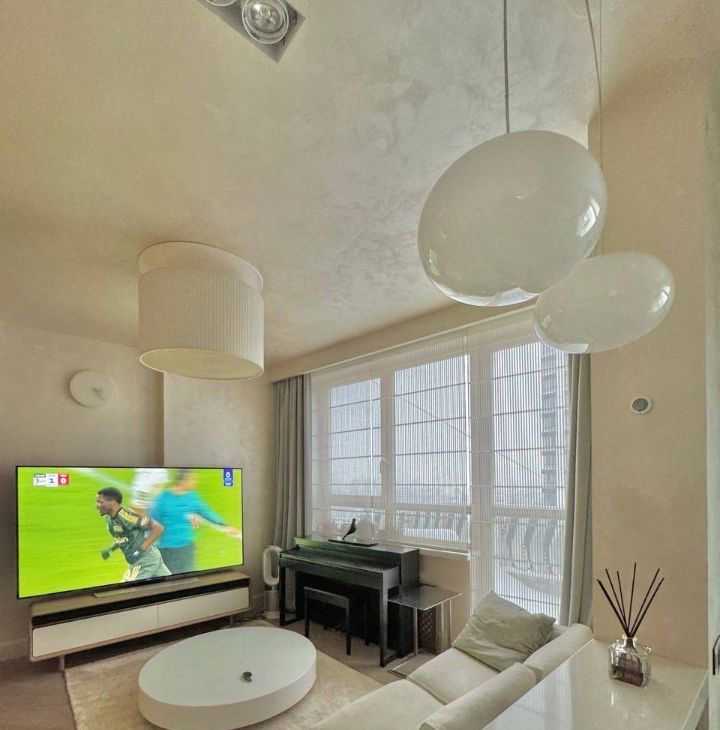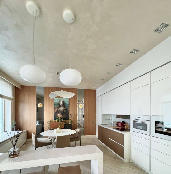 Гостиная: Портальные двери шириной 5 метров, панорамное остекление с приватным напылением, телевизор Samsung диагональю 100 дюймов, Hi-Fi система встроенная в тумбу. Диваны Minotti. Итальянская кухня со встроенной техникой Miele и V-Zug. Измельчитель, фильтрованная вода, два холодильника Liebherr один из которых винный. Множество сценариев света (ночной, обеденный, праздничный, дежурный).