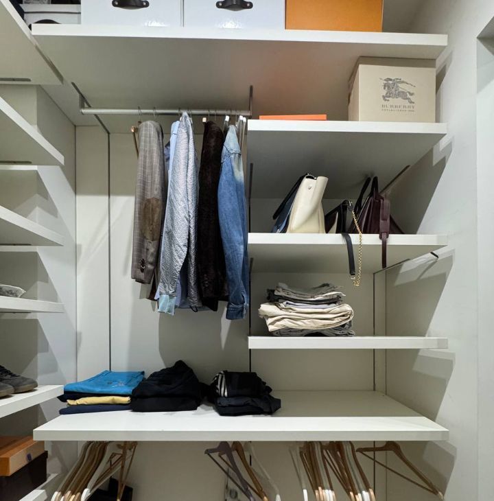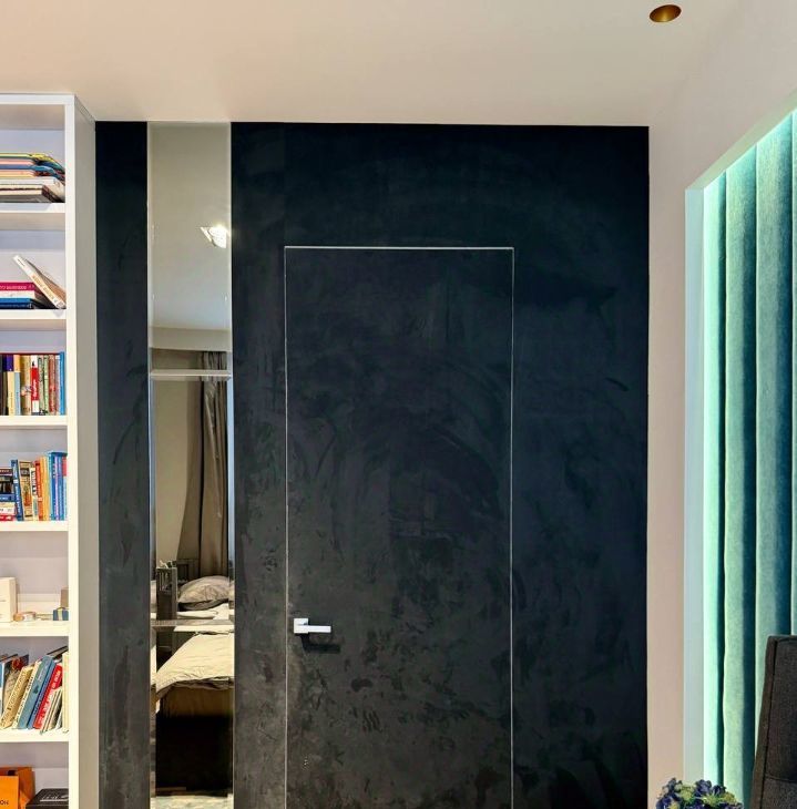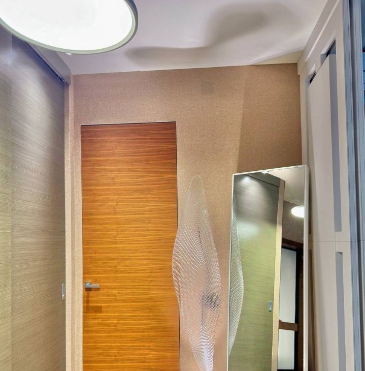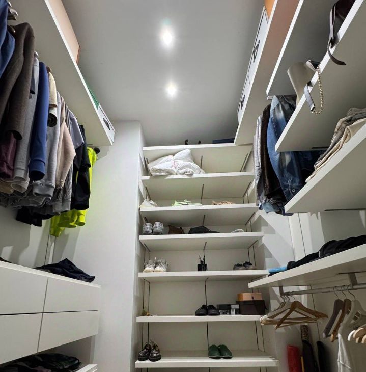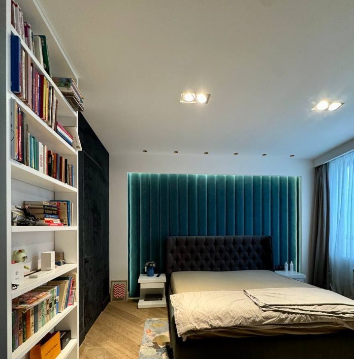 Спальня с собственной гардеробной Poliform, стены в алькантаре, телевизор 55 дюймов, мебель Meridiani со встроенным хранением и с дорогим матрасом Tempur Elite 200х200. Во всех комнатах кондиционирование Mitsubishi.