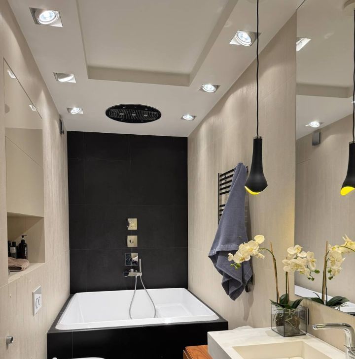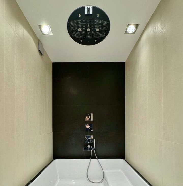 Ванная комната с тропическим душем и гигантской ванной. Вся сантехника AXOR, KEUCO. Множество полок, ящиков и ниш.
