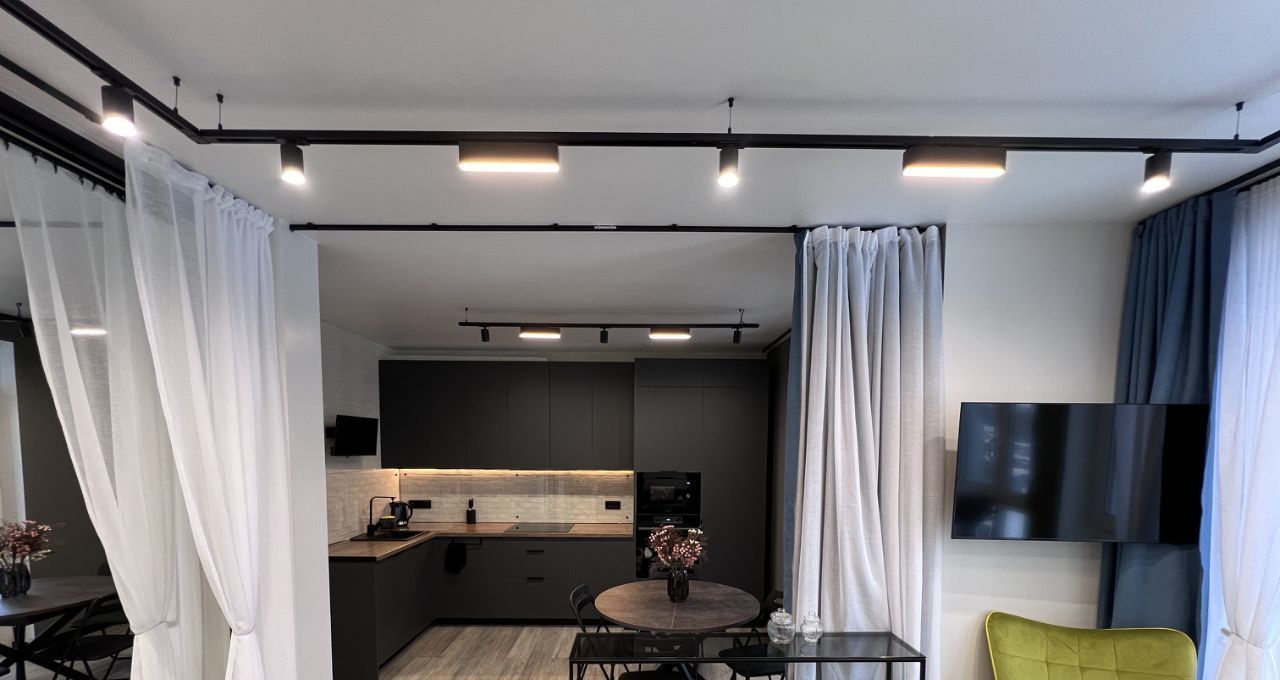 Есть вся необходимая мебель и бытовая техника, в том числе посудомоечная машина, кондиционер, два телевизора, робот-пылесос, утюг, новая посуда и постельное белье.