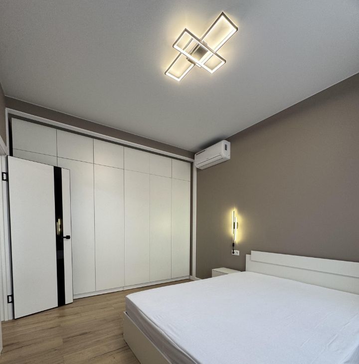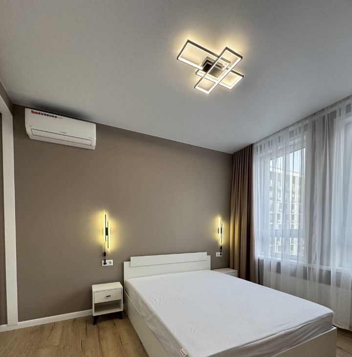 В квартире изолированная спальня с кроватью 200*160 и большим шкафом, кухня с техникой, совмещенный санузел, лоджия с видом во двор.