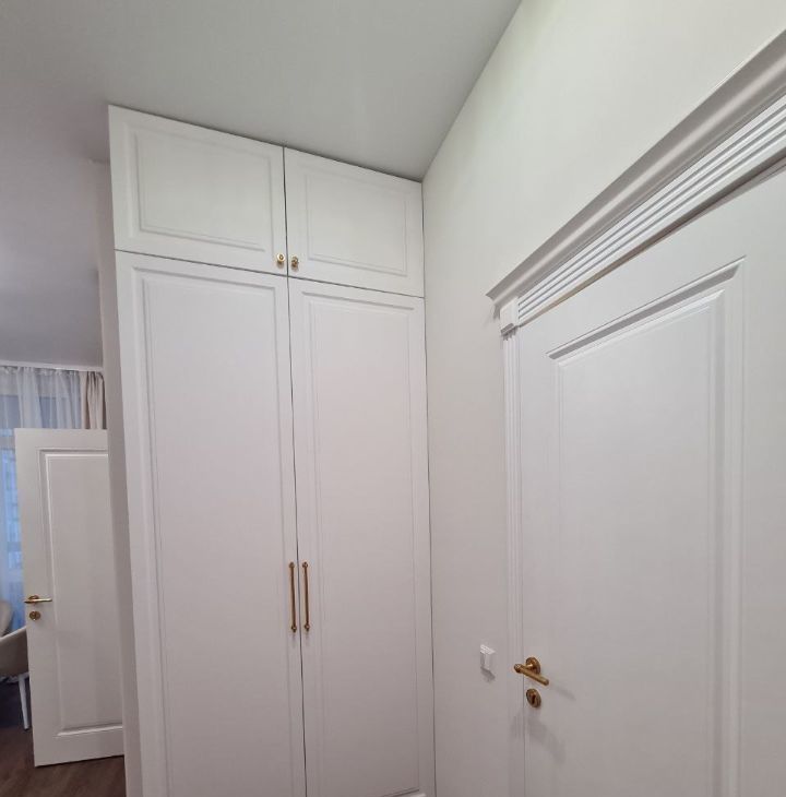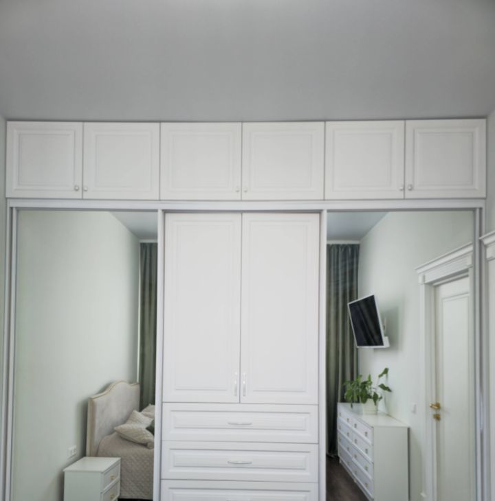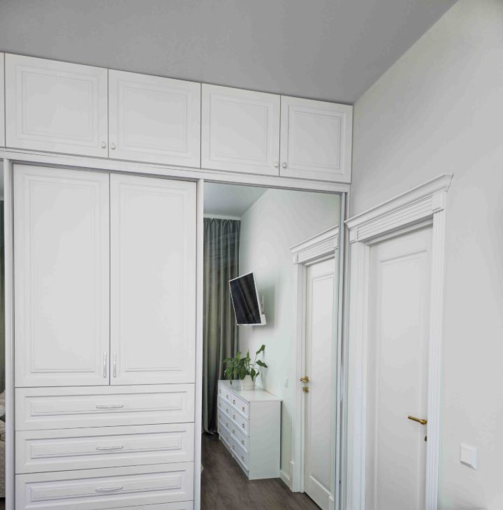 Все шкафы под потолок. Кровать с подъёмным механизмом, диван и стол раскладной. Балкон утеплен, там стоит шкаф и тумба в котором можно хранить все хоз.товары. На полу дорогой кварцвинил.