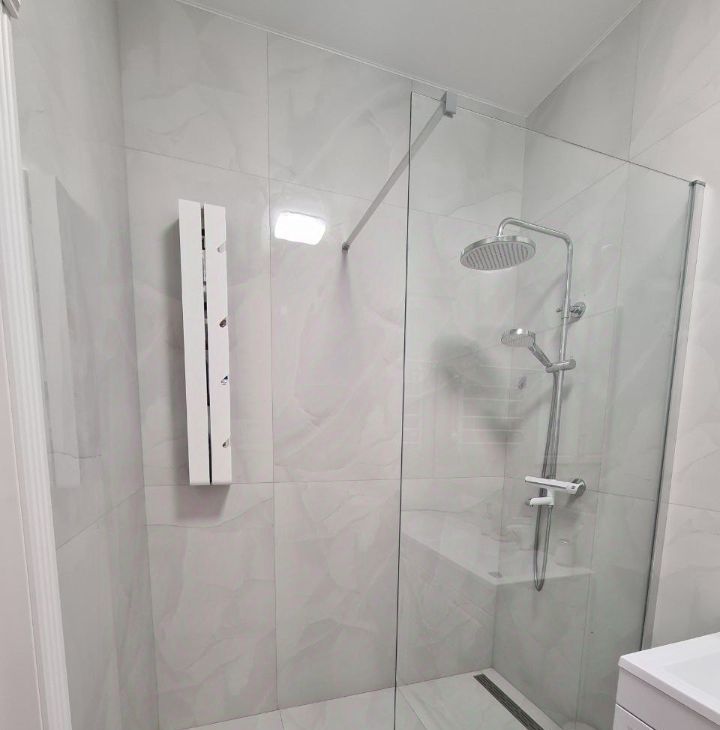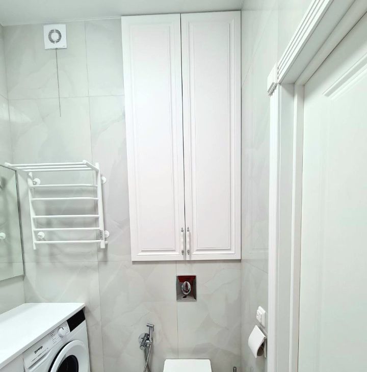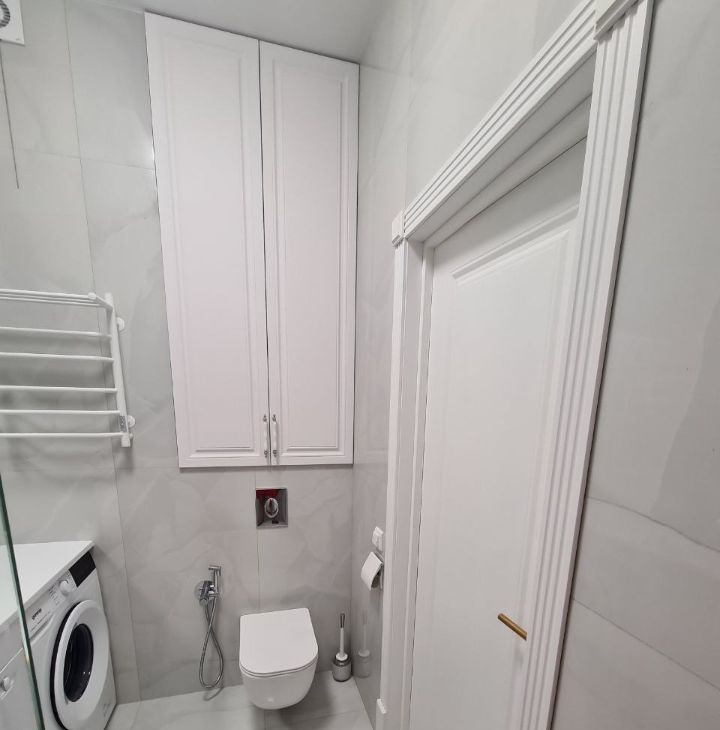 В ванной просторная душевая, пол с обогревом, широкая тумба с ящиками и стиральной машинкой и встроенный шкаф над инсталляцией.