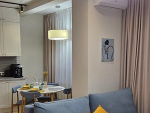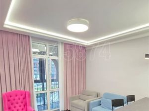 В квартире выполнен качественный евро ремонт, натяжные потолки с подсветкой, пол тёплый по всей кв, на лоджии и санузеле. Кухня объединена со спальной комнатой.