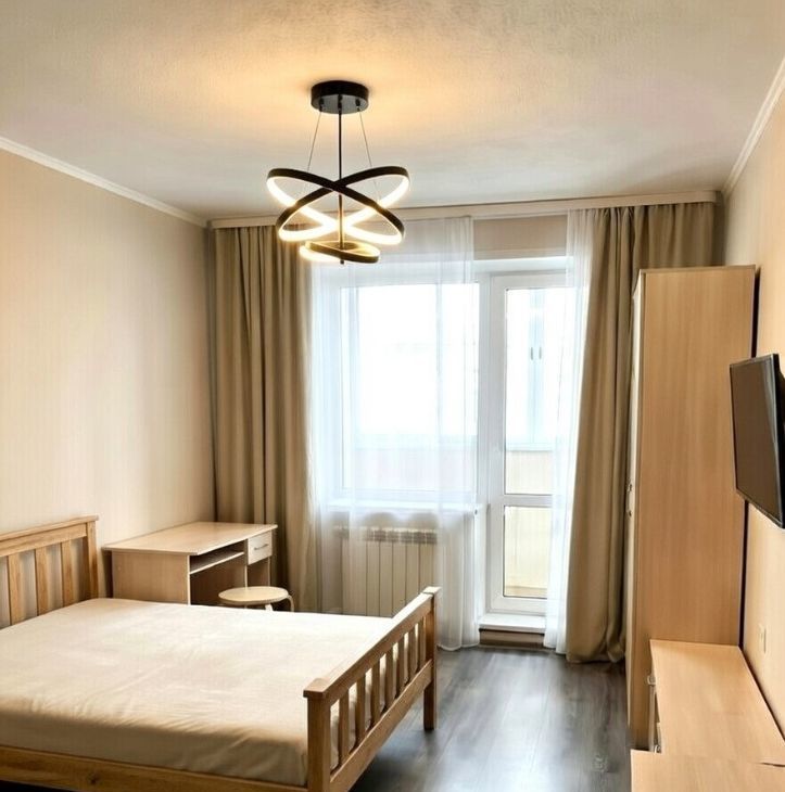Спальня большая и уютная — кровать удобная, телевизор на стене, рабочий стол, места хватает на всё.