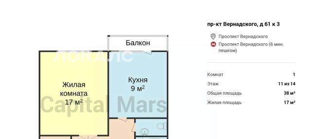 1-к кв. Москва просп. Вернадского, 61к3 (40.0 м²)