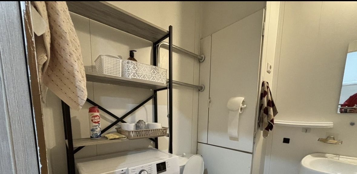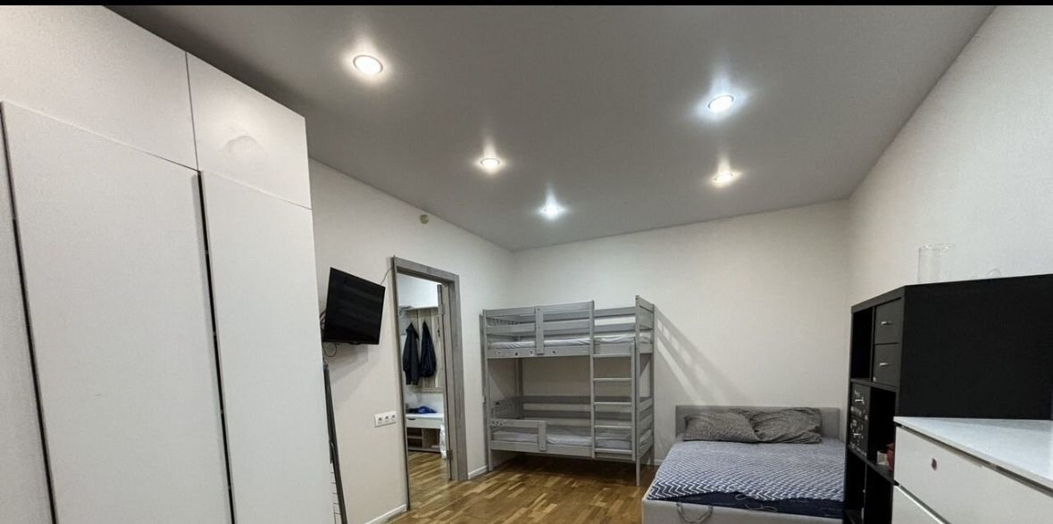 В квартире есть всё необходимое для комфортного проживания: кровать, диван, холодильник, стиральная машина, двухьярусная детская кровать, телевизор, шкафы.