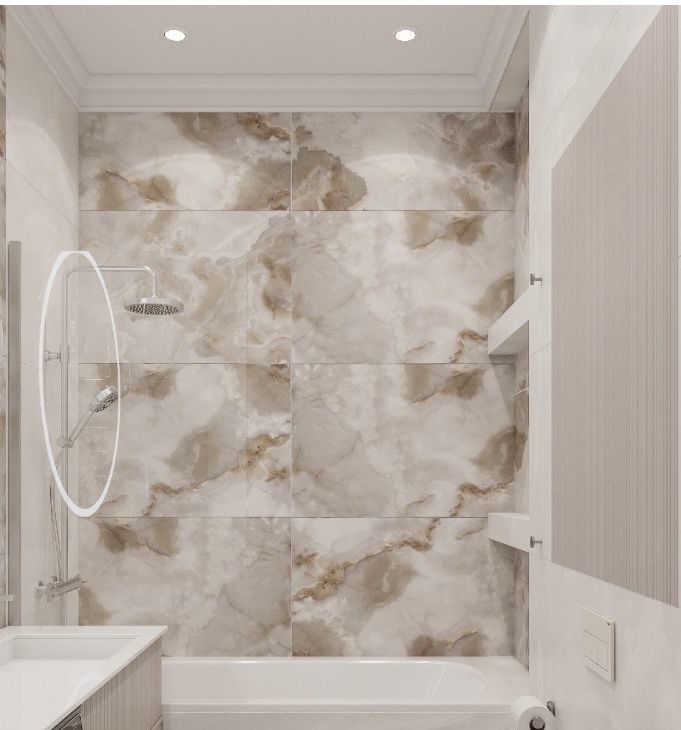 Стильный санузел с ванной, нишами хранения и местом под технику