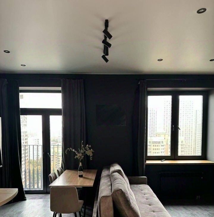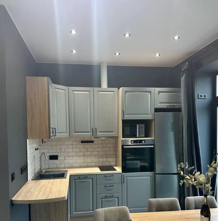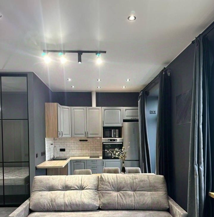 Кухня и комната обставлены современной мебелью.