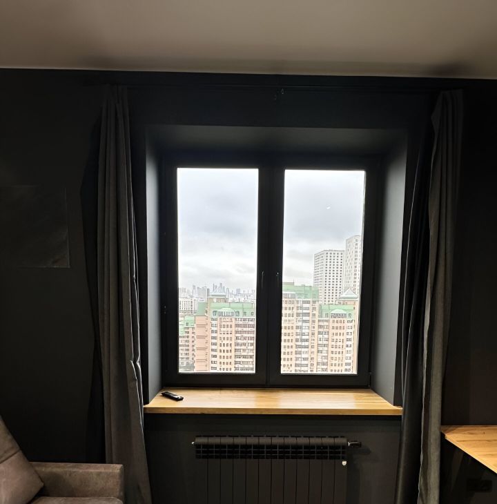 Из окна открывается вид на тихий двор, что создаёт атмосферу уюта и спокойствия.