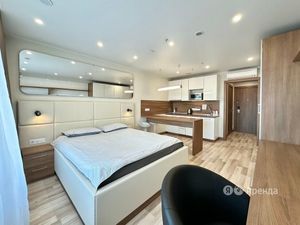 Функциональная планировка: в комнате есть зона спальни, где установлена двуспальная кровать с ортопедическим матрасом, зона отдыха с раскладывающимся диваном и телевизором, обеденная зона. Предусмотрена полноценная гардеробная комната и шкаф в прихожей. Большая ванная комната. Кухня укомплектована всей необходимой бытовой техникой и посудой.