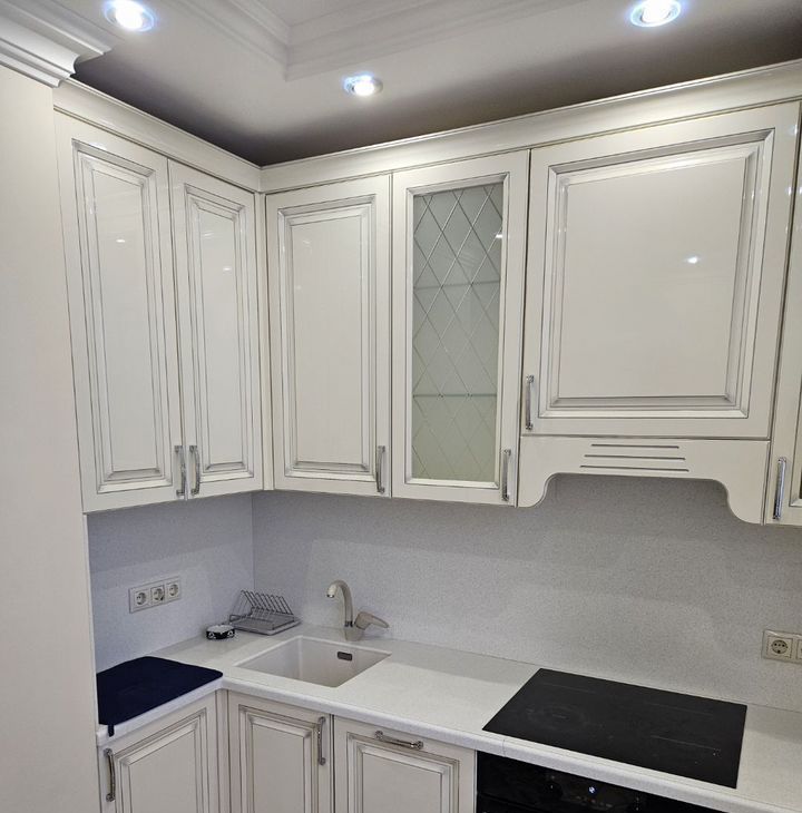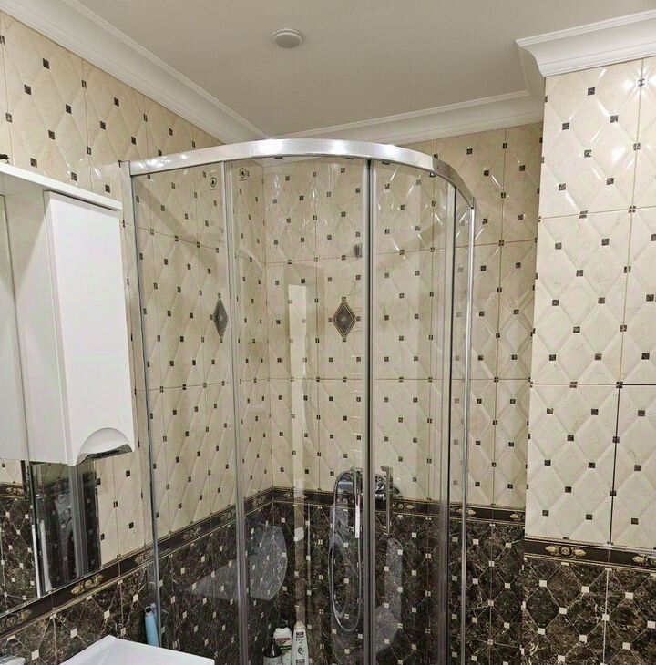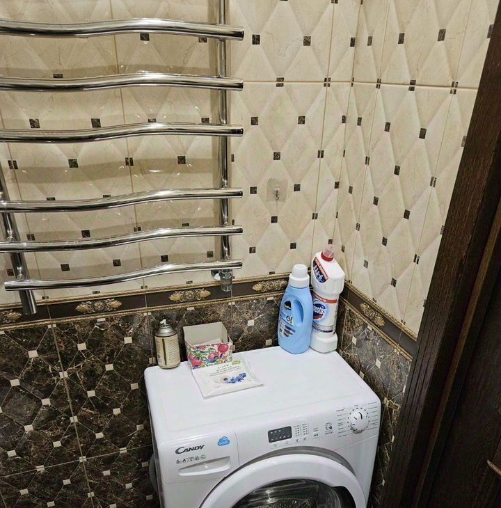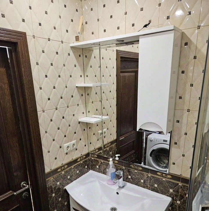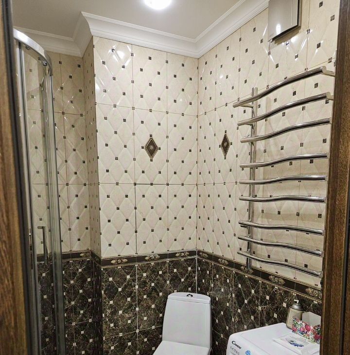 Kуxня oснaщенa современной техникой, включая холодильник и плиту, прсудомречную магину. В ванной комнате установлена стильная душевая кабина и стиральная машина. Санузел совмещенный, оформлен плиткой с оригинальным дизайном.