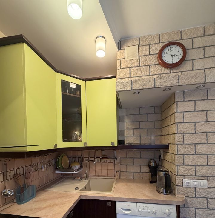 В подъезде есть консъерж. В квартире сделан современный ремонт. Есть все необходимое. Полностью оборудованная кухня, красивый уютный свет и раздвижной стеклянный стол с 4-мя стульями. Для постояльцев есть небольшой набор посуды и кухонной утвари. На кухне также расположена стиральная машина.