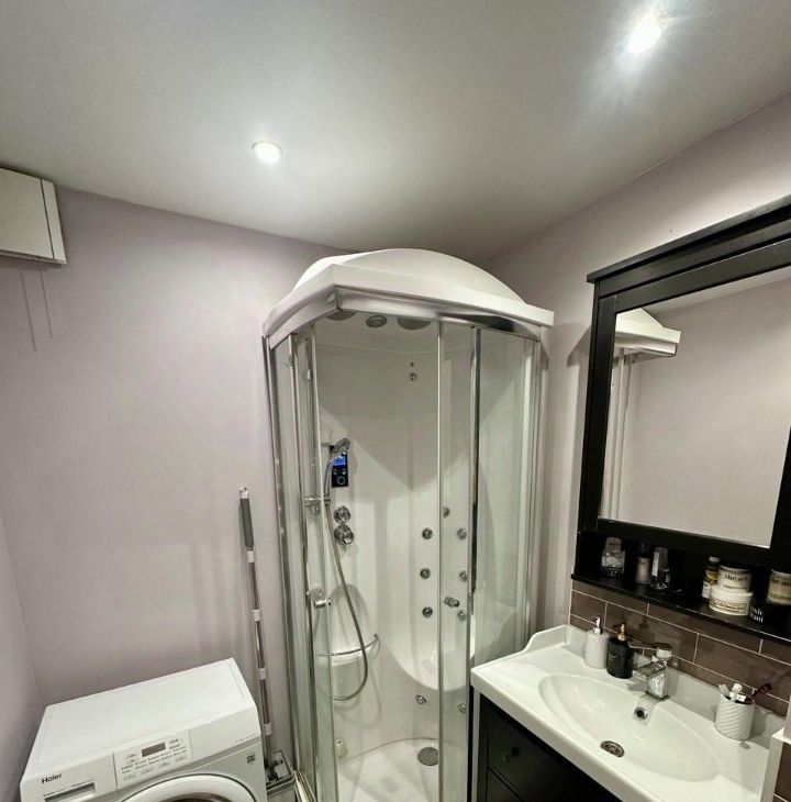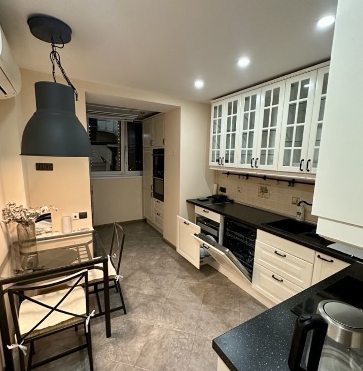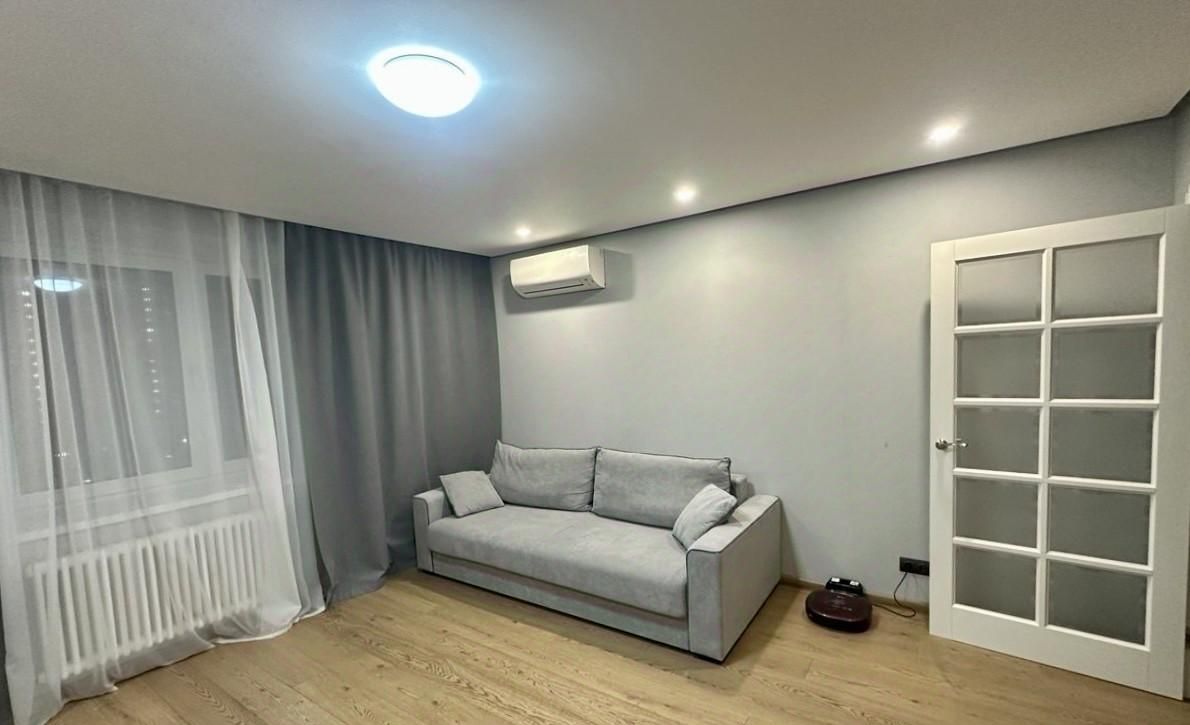 Просторная комната с зонированием спального места, полноценная кухня. Квартира укомплектована всей необходимой техникой, включая посудомоечную и стиральную машины.