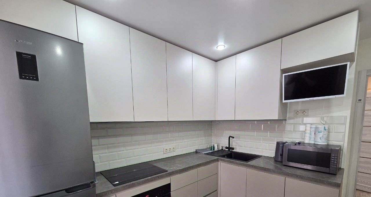 на кухне индукционная варочная панель, духовой шкаф, микроволновка, посудомоечная машина, телевизор, фильтр для воды в кране,