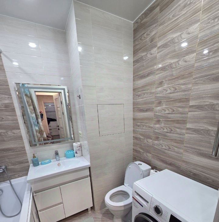 в санузле установлена стиральная машина, ванная, гигиенический душ и тумба с зеркалом,