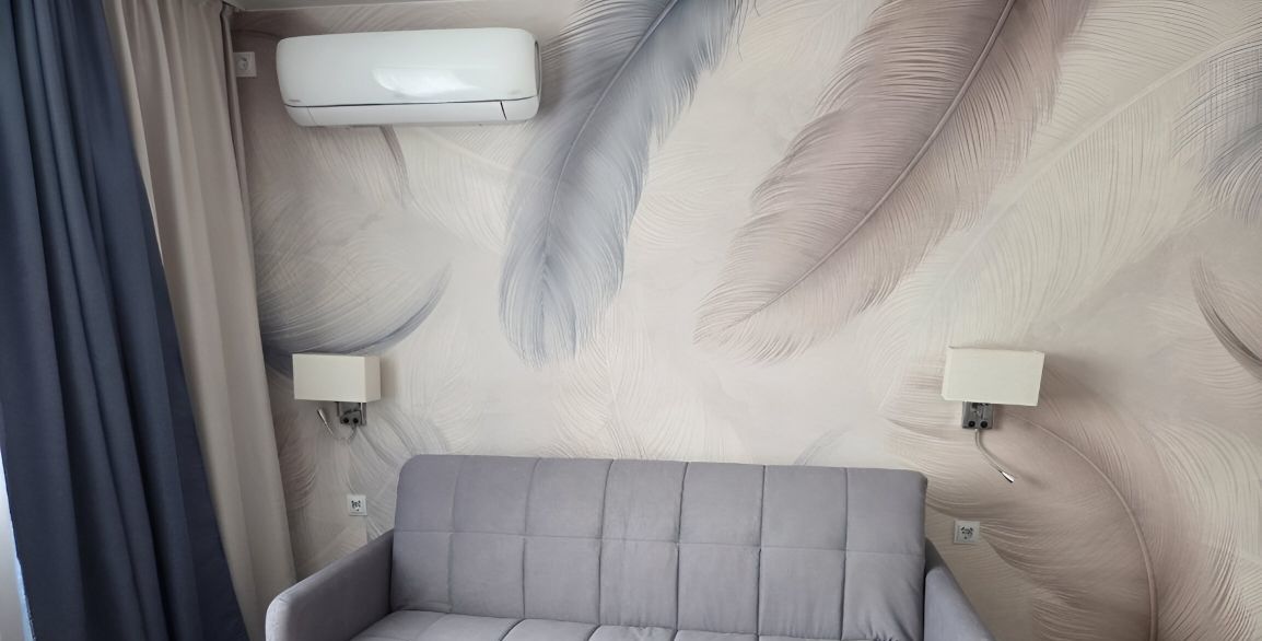 В комнате диван с спальным местом 180см, тумба, телевизор и кондиционер,