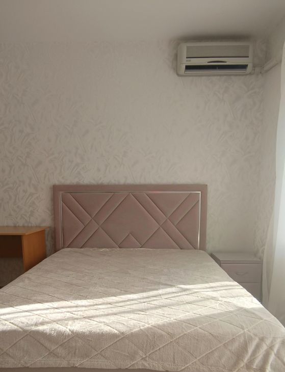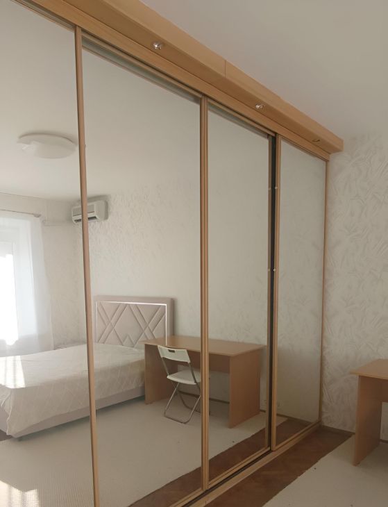 В комнате 2-х спальная кровать, диванчик, большой зеркальный шкаф, кондиционер.