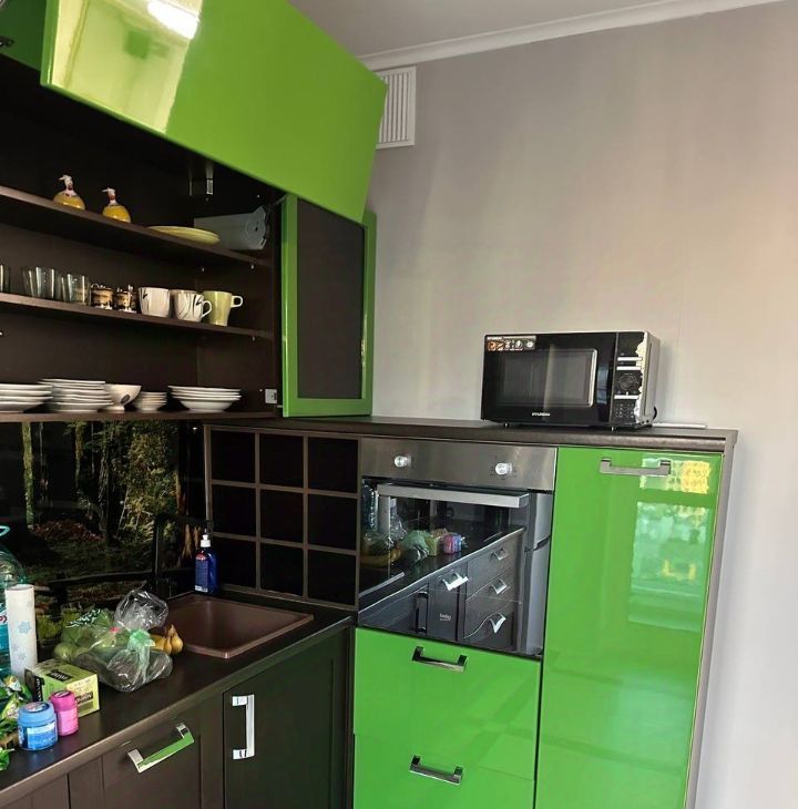 Кухня: холодильник, духовка, индукционная плита, СВЧ-печь, полный набор посуды, чайник