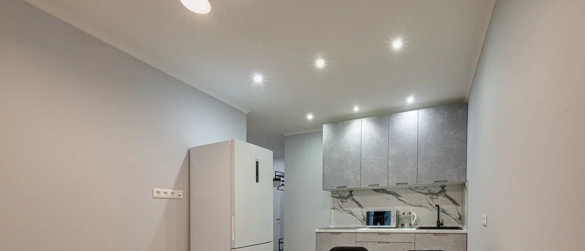 Просторная кухня-гостиная оснащена всем необходимым: холодильник, микроволновая печь, варочная панель.