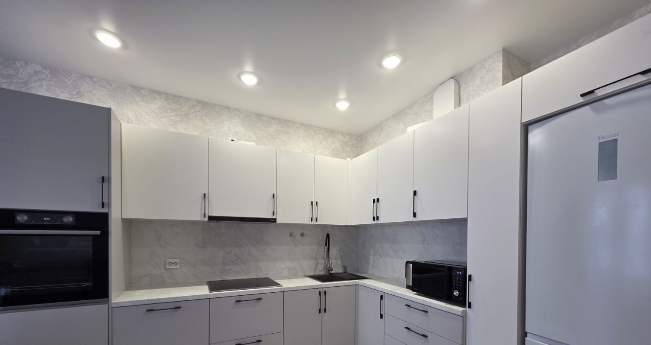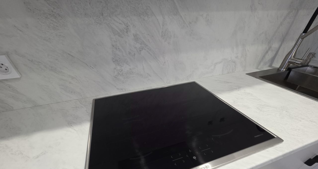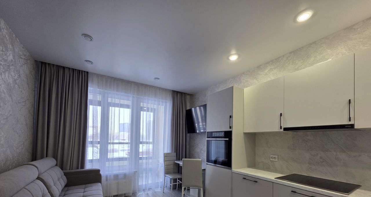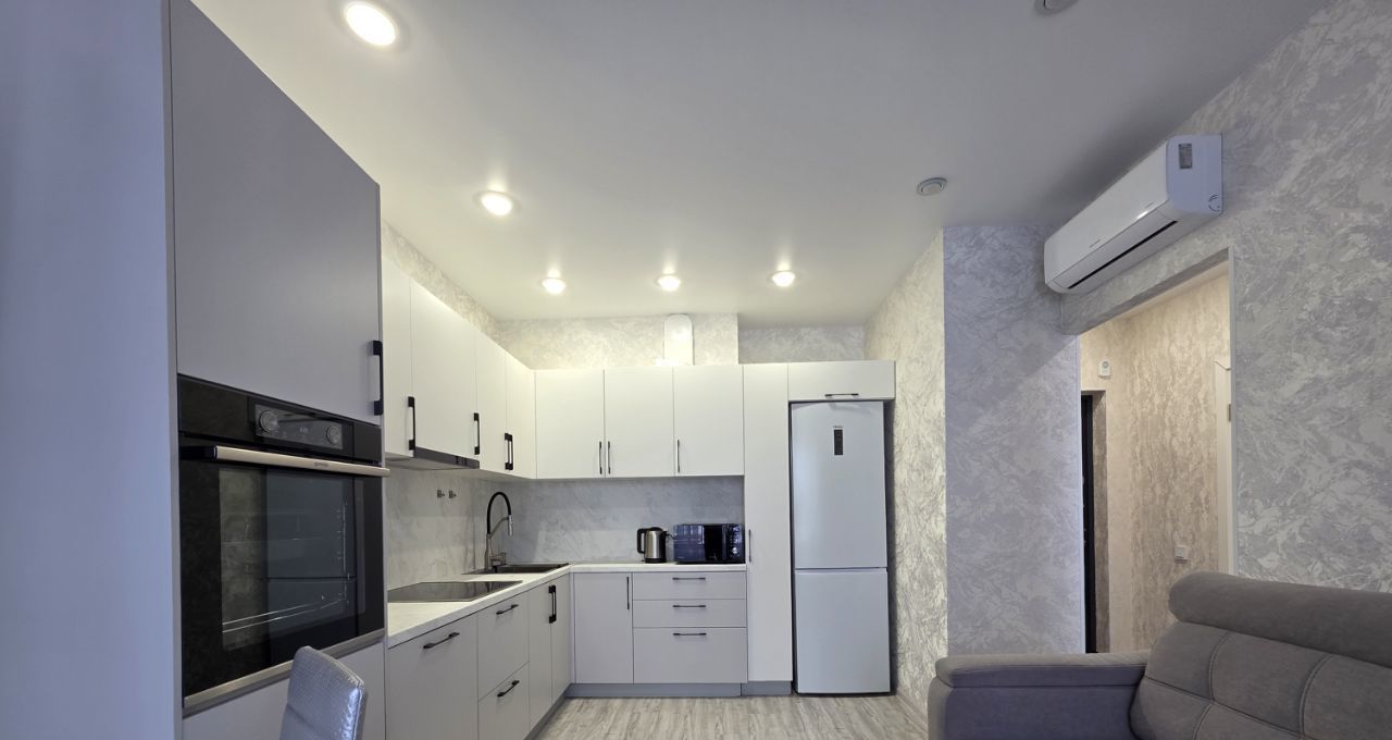 Просторная кухня гостиная со всей техникой, включая посудомоечную машину, индукционную плиту и кондиционер.