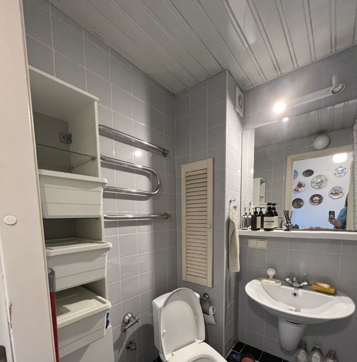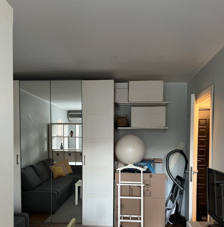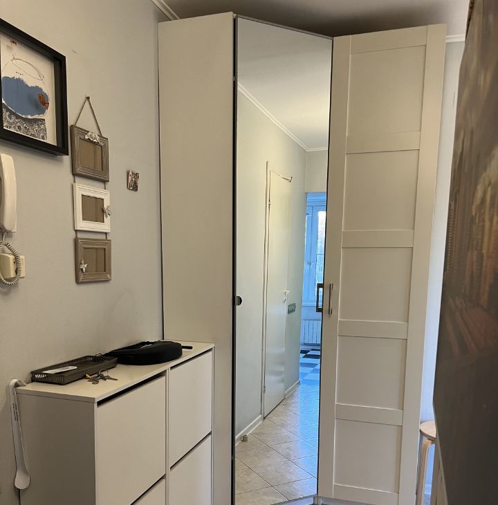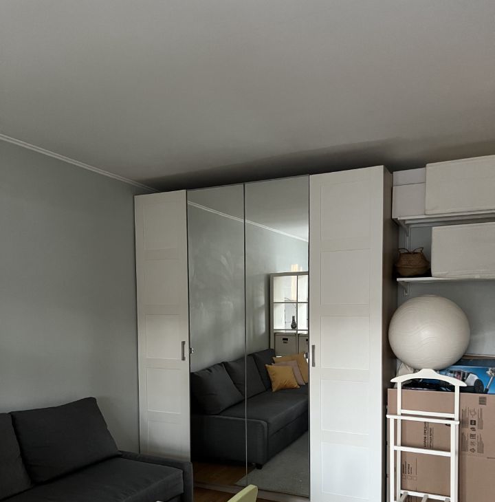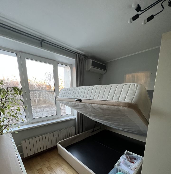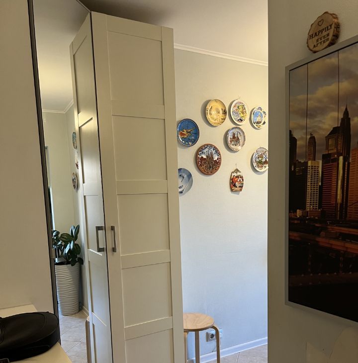 Вся мебель и посуда - икеа, очень качественная и добротная. Большой платяной шкаф в комнате, куда вмещаются вещи 2-х человек спокойно. Кровать с подъемным механизмом также выполняет функции шкафа - много всего помещается в ней.