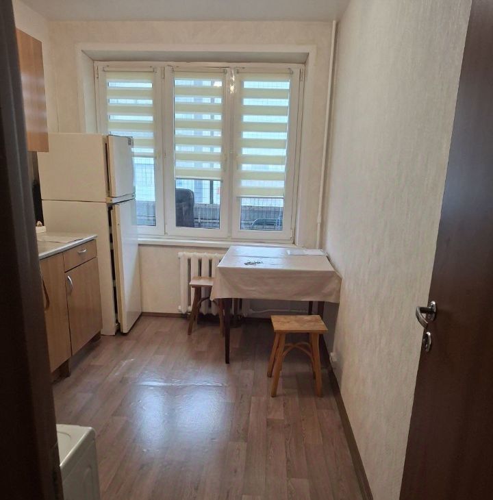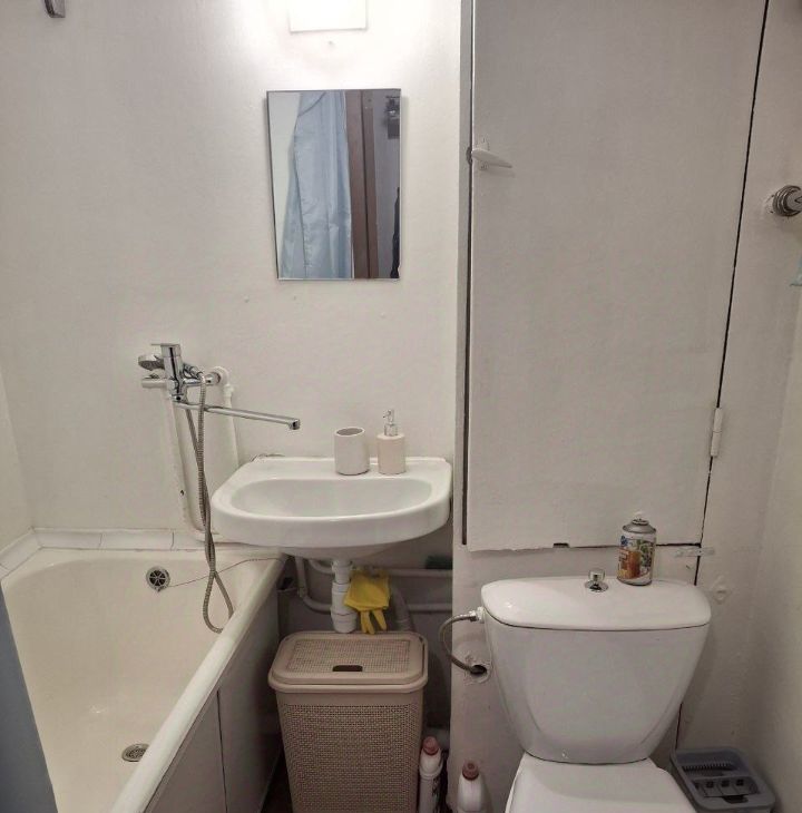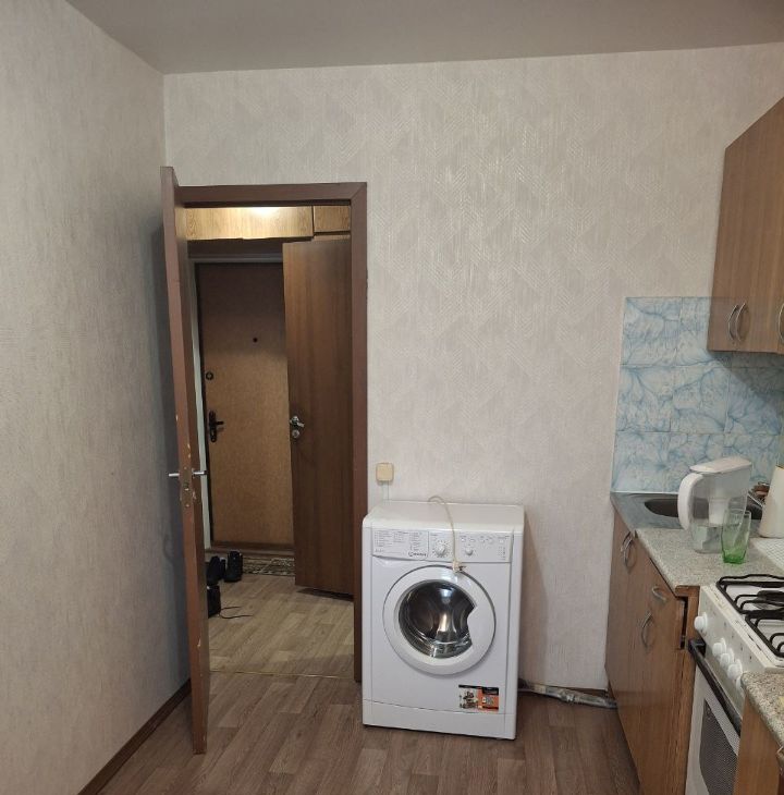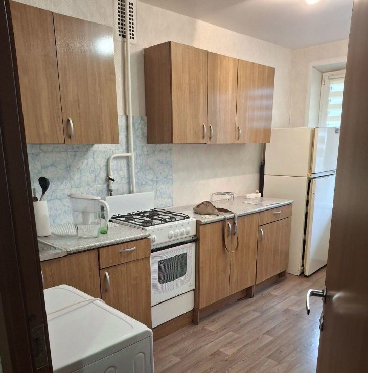 Кухня оборудована необходимой техникой: холодильник, плита и стиральная машина. Из мебели — удобный диван и стол. Санузел совмещенный, оснащен ванной и туалетом.