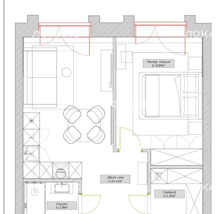 Имеется отдельная гардеробная комната, полностью оборудованная системой хранения