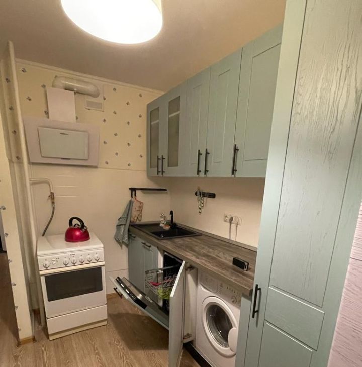 Новый кухонный гарнитур с бытовой техникой (посудомоечная машина, стиральная машина, холодильник); в комнате: кровать, шкаф, письменный стол, телевизор, кондиционер.