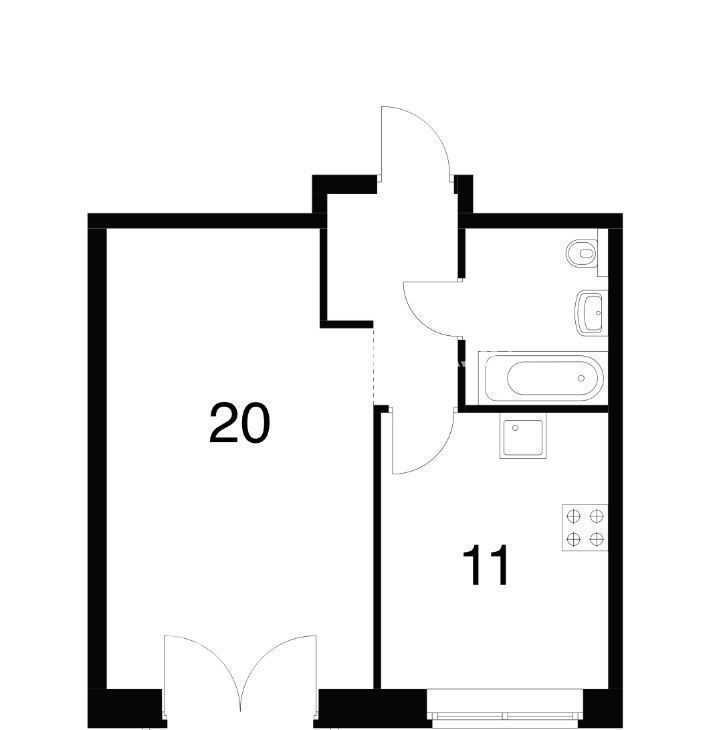 • Общая площадь квартиры 39м2: комната 20м2, кухня 11м2, ванная 3,6м2. Все комнаты изолированы.