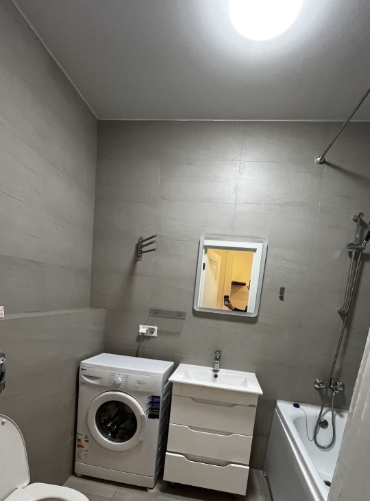 Кухня оборудована всем необходимым: холодильник, плита, микроволновая печь и обеденный стол. Ванная комната совмещена и оснащена современной сантехникой, включая стиральную машину.