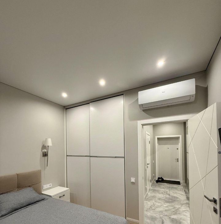 Уютная спальня с выходом на балкон оснащена кондиционером, вместительным шкафом, большой кроватью с подъемным механизмом и ортопедическим матрасом и тумбами