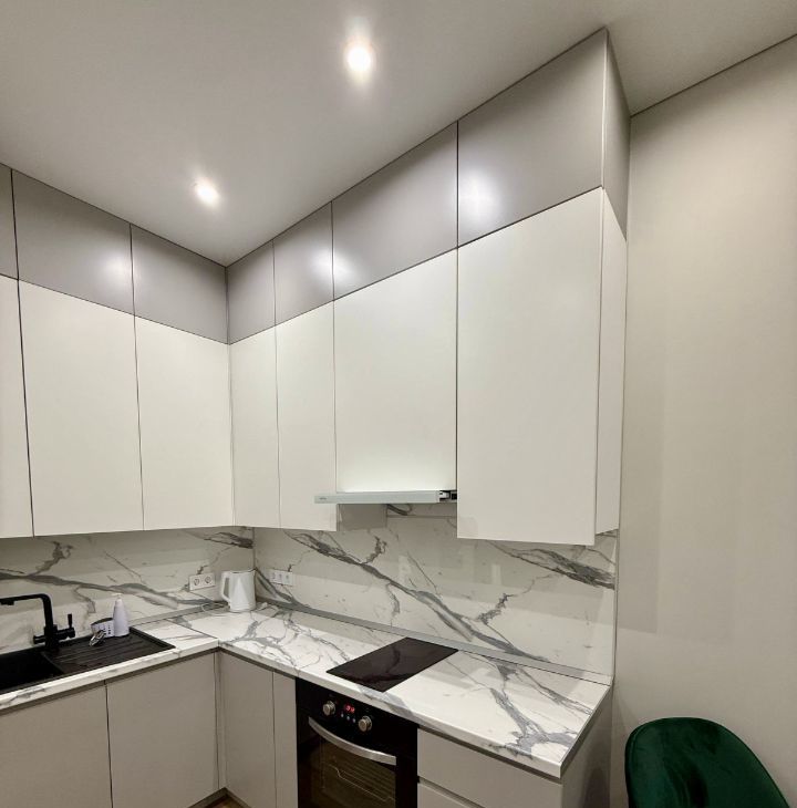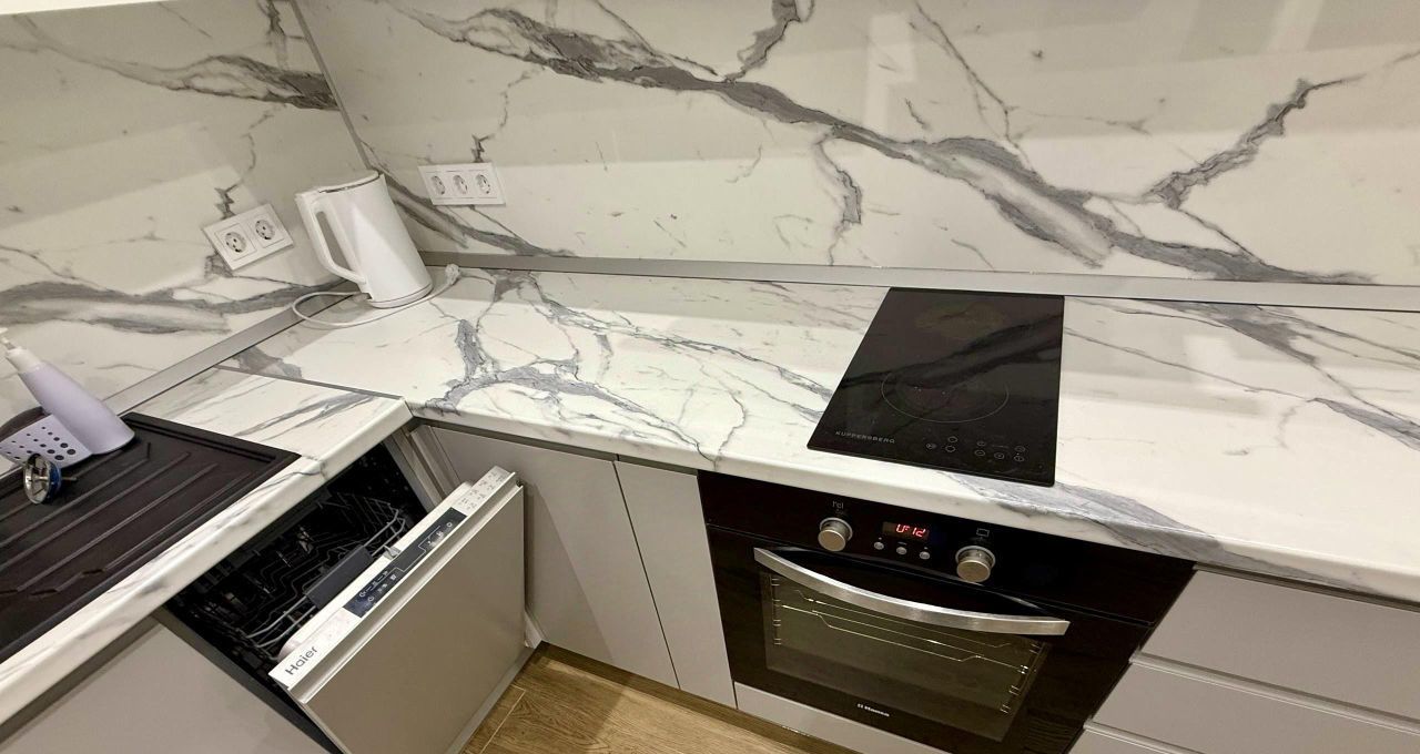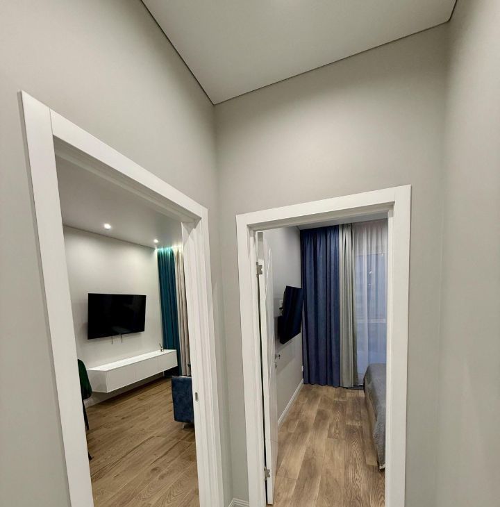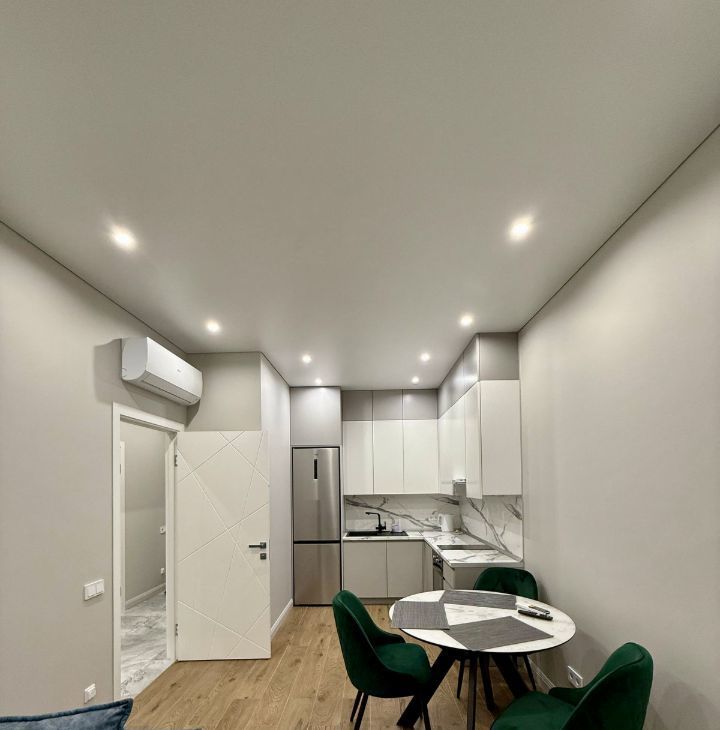 Просторная кухня-гостиная изолирована отдельной дверью и оборудована кухонным гарнитуром и всей необходимой техникой: варочная панель, вытяжка, посудомоечная машина, СВЧ-печь, холодильник, кондиционер, ТВ, тумба, обеденная группа, диван (разбирается в полноценную кровать)
