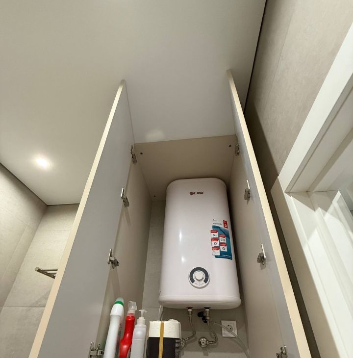 Ванная оборудована бойлером, стиральной машиной, зеркалом, шкафом