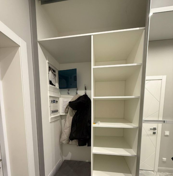 Прихожая обустроена крючками для одежды, вместительным шкафом, галошницей-скамьей