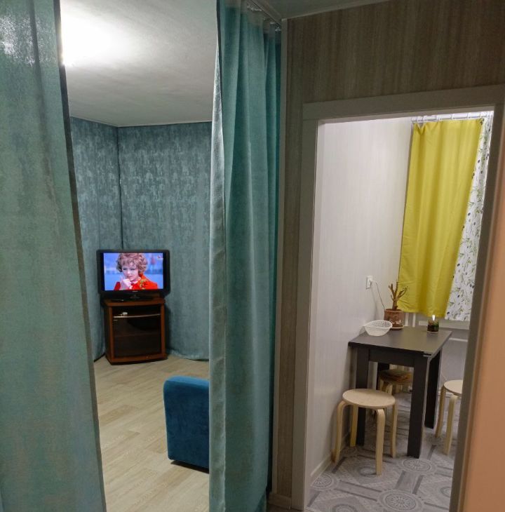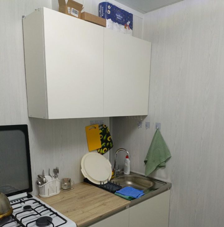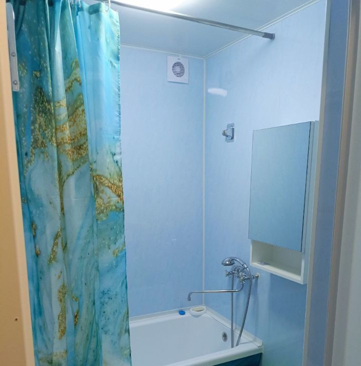 Кухня компактная, оборудована газовой плитой и обеденной зоной. Санузел совмещенный, оформлен в светлых тонах. В комнате установлен телевизор.