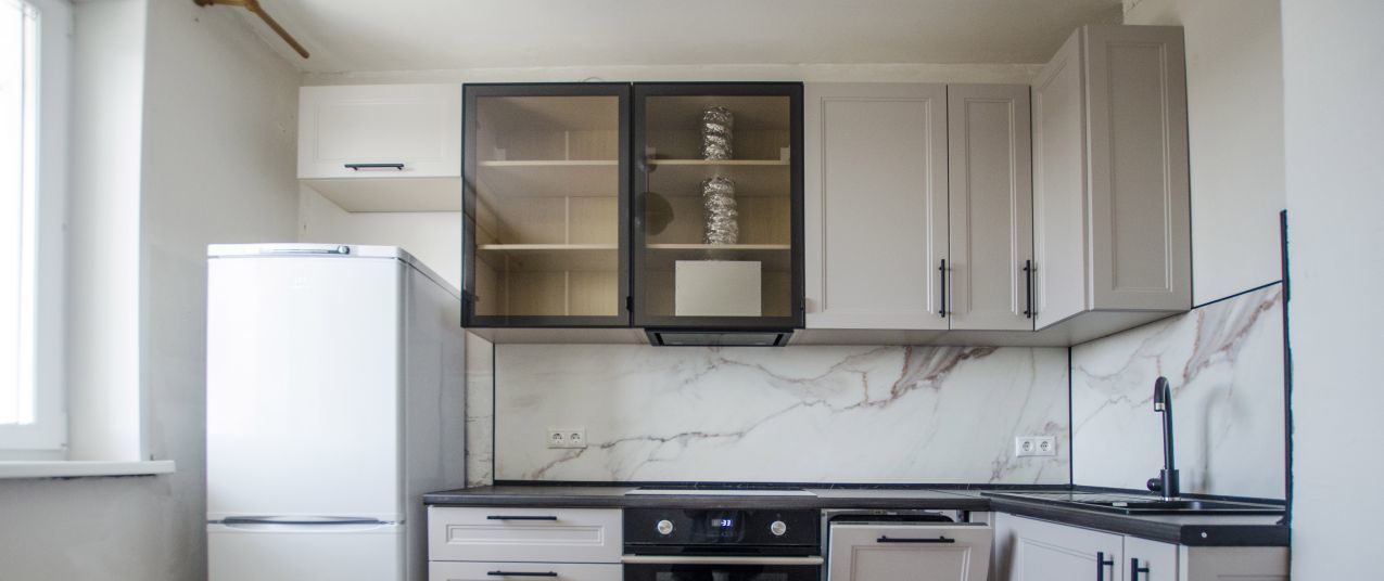 В просторной кухне - функциональное рабочее место, оснащенное современной новой бытовой техникой, включая духовую печь и варочную панель и посудомоечную машину под единой столешницей, вытяжку, двухкамерный холодильник. Новый кухонный гарнитур.