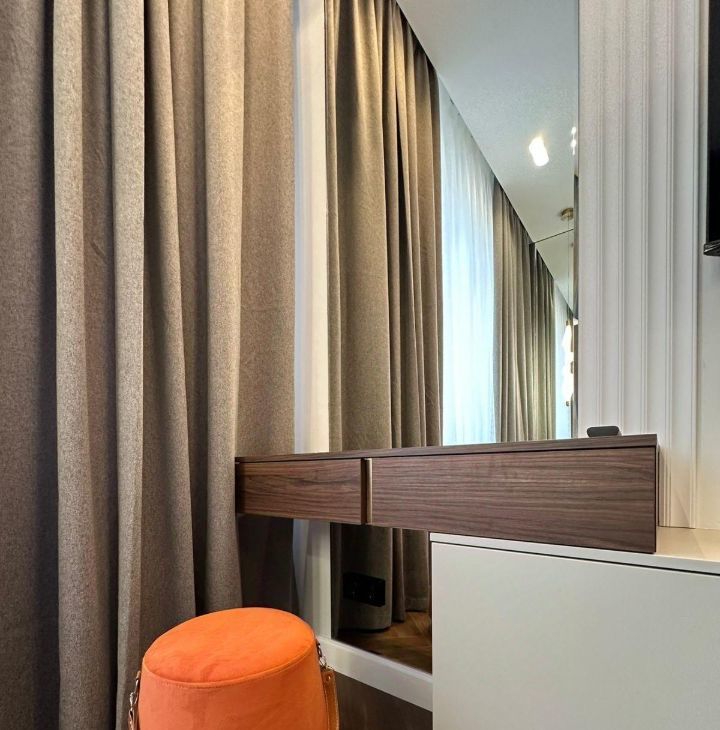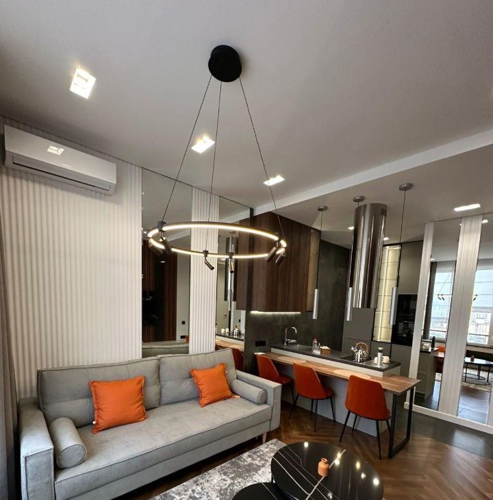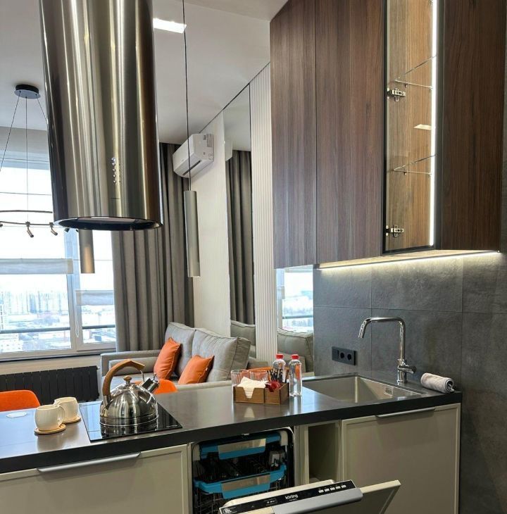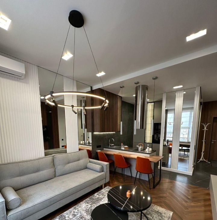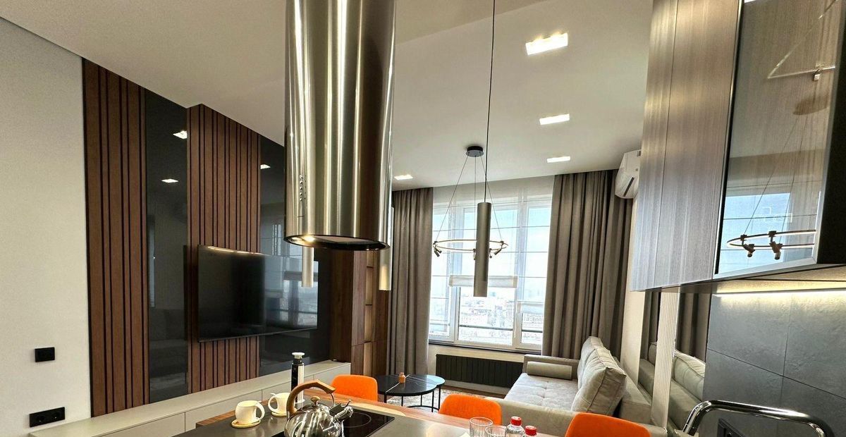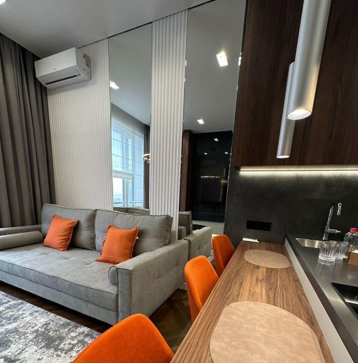 Сдается стильная квартира с дизайнерским ремонтом в новом ЖК Сердце Столицы. Квартира находится на 23-м этаже современного 41-этажного здания. Общая площадь составляет 46 кв. м, а окна выходят на улицу, что обеспечивает прекрасный вид и много естественного света.