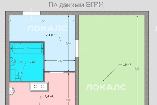 Общая площадь квартиры составляет 37.7 кв. м., жилая 19 кв. м., кухня 8,4 кв. м.