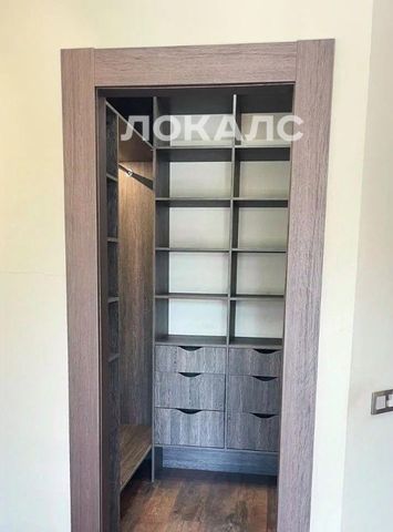 Планировка : просторная кухня и отдельная гостиная с большой гардеробной комнатой .